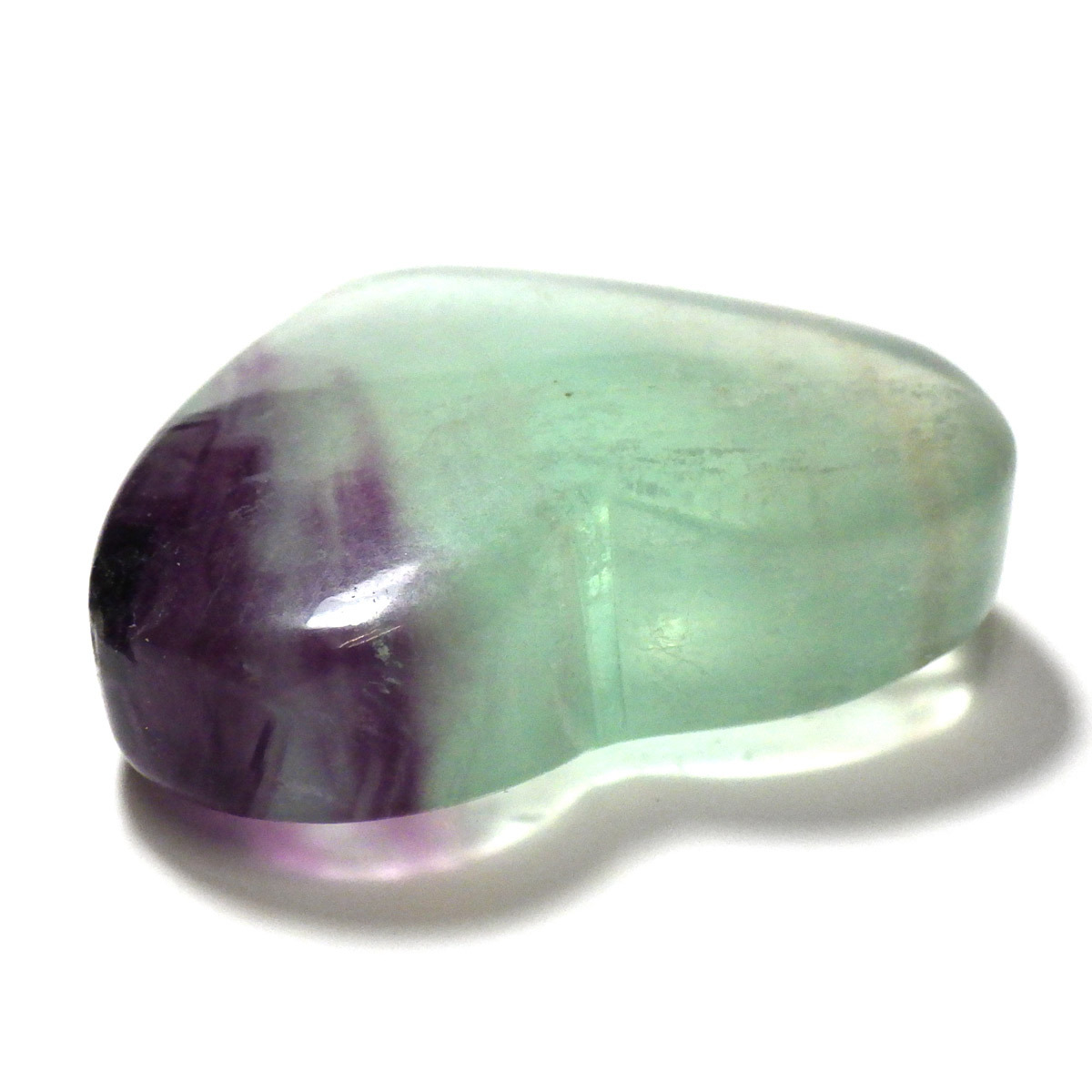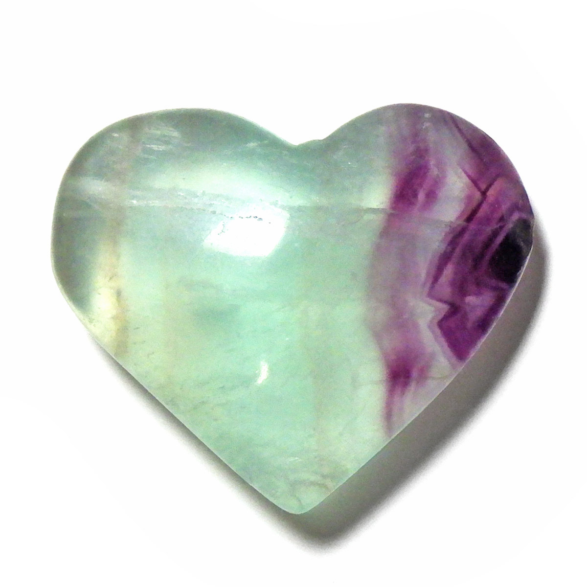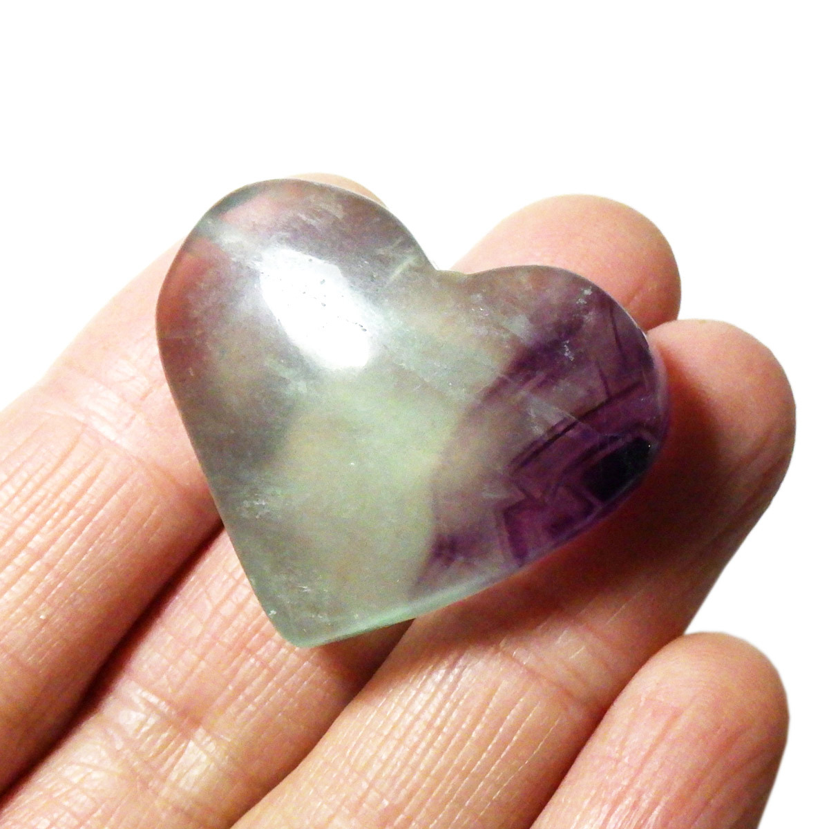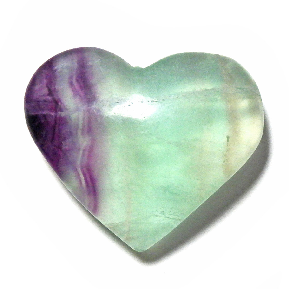 チャイナ産のフローライトで出来たハート形の置物です。透明度が非常に高く、ひとつの石の中に多彩な色彩が美しく広がっています。まさに蛍石(フローライト)という名の通り、光の角度によって異なる表情を見せてくれるのが魅力です。光にかざして透かすと、ピンクやグリーン、ブルーなどの色のグラデーションが複雑に入り混じり、幻想的な美しさを楽しめます。ハート形の優しいフォルムと相まって、インテリアとしてもかわいらしく、飾っていただけやすいかと思います。