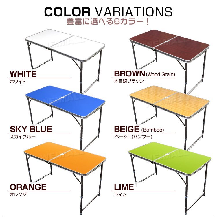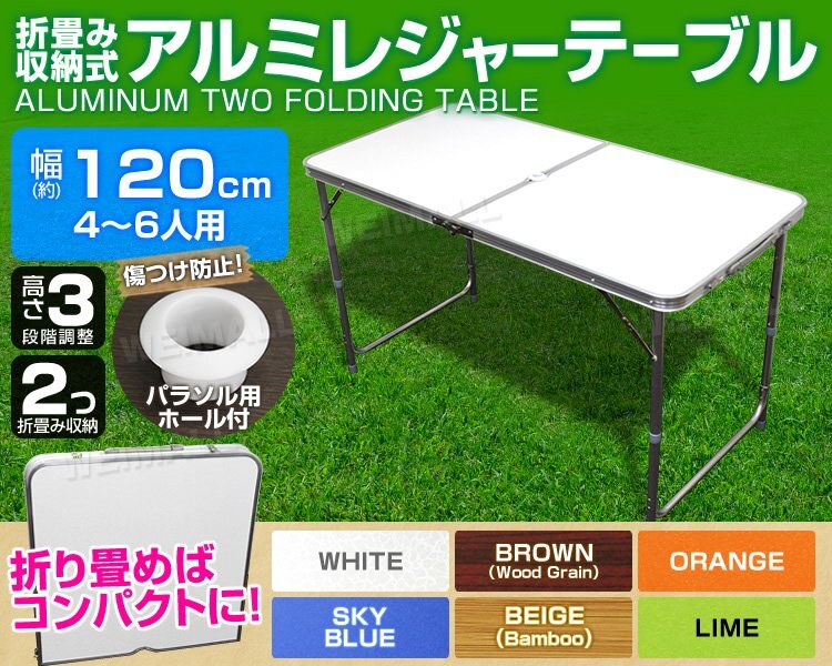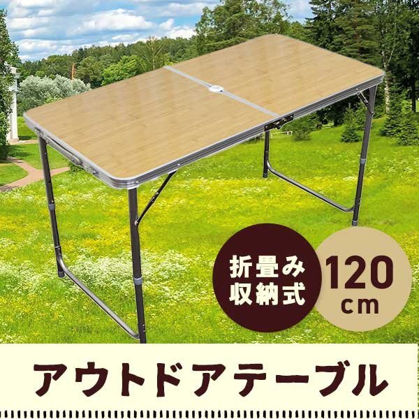 車のトランクに入れる時や持ち運びの際にもとても便利な取っ手付きで持ち運びもラクラク!! サビに強いアルミを使用。 天板には防水加工が施されています。 テーブルは、3段階の高さ調節ができ、お好みのスタイルに合わせて「ハイスタイル」「ロースタイル」の2パターンでお使いいただけます。 天板中心部にはパラソル用ホールがあるので、ベランダやテラスでの使用にもおススメです。 キャンプ、バーベキュー、お花見などにとても便利。 気軽にアウトドアレジャーをお楽しみいただけます!! 【商品仕様】 テーブルサイズ(約): ・幅120cm×奥行60cm×高さ55cm/62cm/70cm ※高さ3段階調節 ・収納サイズ(約):幅62cm×奥行6.5cm×高さ62cm ・カラー:ベージュ(バンブー) ・パラソル用ホール直径サイズ(約):26mm ・材質:アルミ、MDF(耐熱・耐水加工)、ポリエステル、スチール ・重量(約):4.7kg |