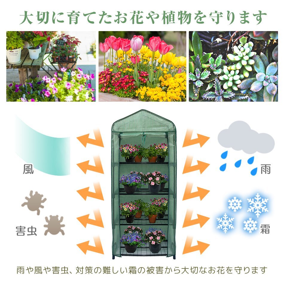 簡単に設置可能な4段用ガーデンハウスです。 雨や風、対策の難しい霜の被害などからお花や植物を守ります。 ビニールカバーを下ろせば害虫対策にも! 暑い夏はカバーを外して、シンプルなフラワーラックとしてもお使いいただけます。 お気に入りの植木鉢やシルクフラワーなどを立体的にディスプレイできます。 網目状の棚板で通気性は抜群!水やりなどの作業にもおすすめです。 コンパクトなのでお庭や玄関、ベランダに置いても邪魔にならず、 お天気が気になる時には室内にも置けるサイズ感です♪ カバーは巻き上げてロープで留められます。 お手入れ作業中や、ハウス内の温度上昇が気になる時はカバーを巻き上げ、 風をいれて温度調節が可能です。 組み立ては工具不要! 部品を差し込んで棚板を乗せるだけで簡単に完成します。 【商品詳細】 タイプ:4段 カラー:グリーン(カバー)、ブラック(棚) サイズ(約):幅69cm×奥行き49cm×高さ158cm ※カバー含む 重量(約):4.8kg 棚耐荷重:1段につき約5kg 素材 ・カバー :ビニール ・フレーム:スチールパイプ 【注意事項】 ・強風の際には外での使用をお控えください ・仕様/デザインは改良のため予告なく変更することがあります |