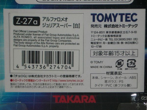 チョロQzero Z-27a アルフォロメオ ジュリアスーパー 白です。台紙に少し傷みがありますので。ご了承の上入札下さい。商品の状況は写真でご判断の上、ノ-クレ-ム・ノ-リタ-ンでお願いします。保証はできませんが、定形外郵便での発送も可能です。 ※ 最初の連絡は集計などで時間がかかるため、翌日または翌々日になります。