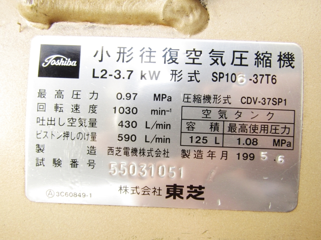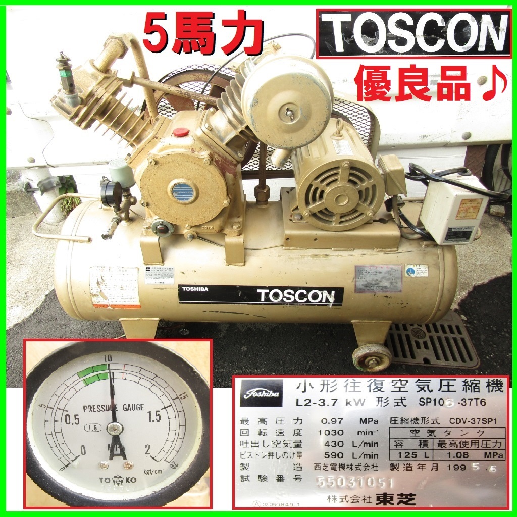 | 美品 大阪 純国産 5馬力 125Lタンク コンプレッサー TOSCON 3.7KW トスコン 動力 エアーコンプレッサ 満充填10.2気圧 自動停止まで7分 再充填1分45秒 優良品♪ | |