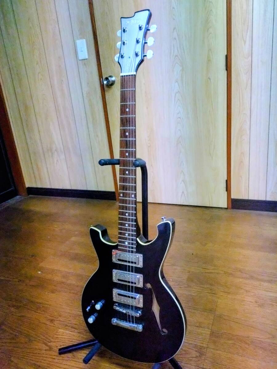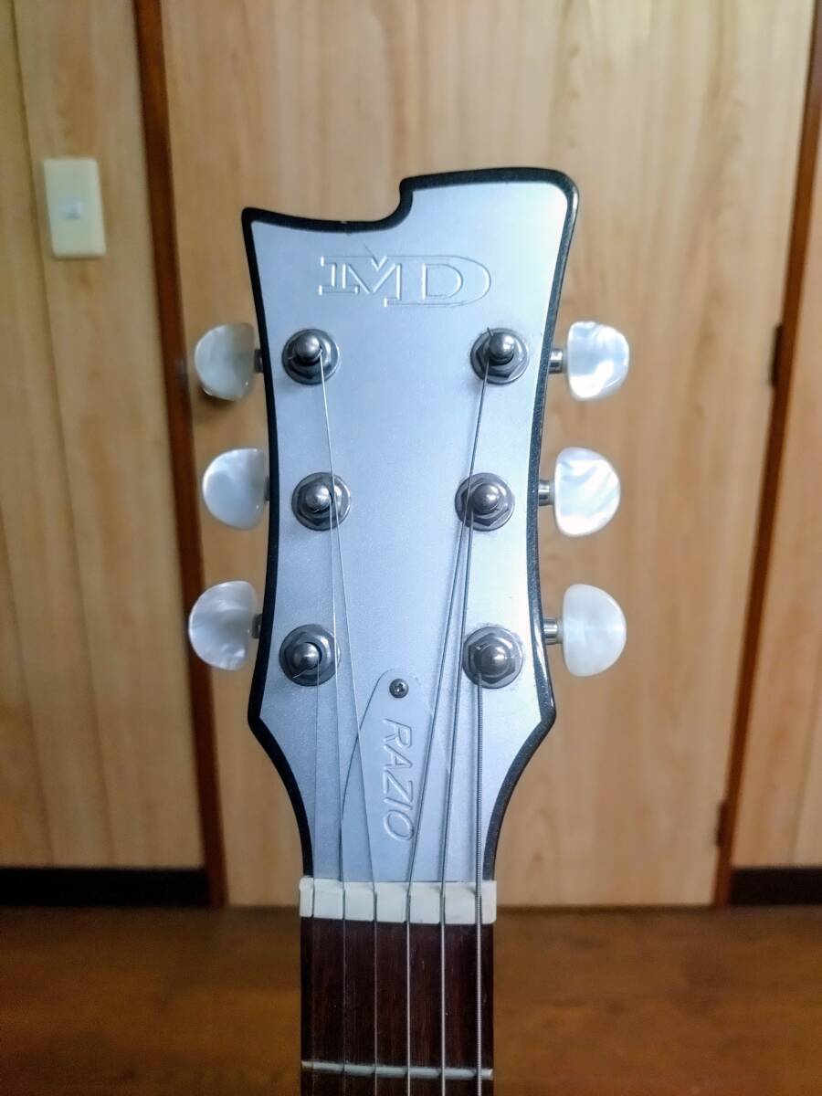 ヘッドTOPにアルミ板、トラスロッドカバーにはRAZIOの文字が刻まれていまう。ホローボディ、ミニハム3PU仕様でビザールのように