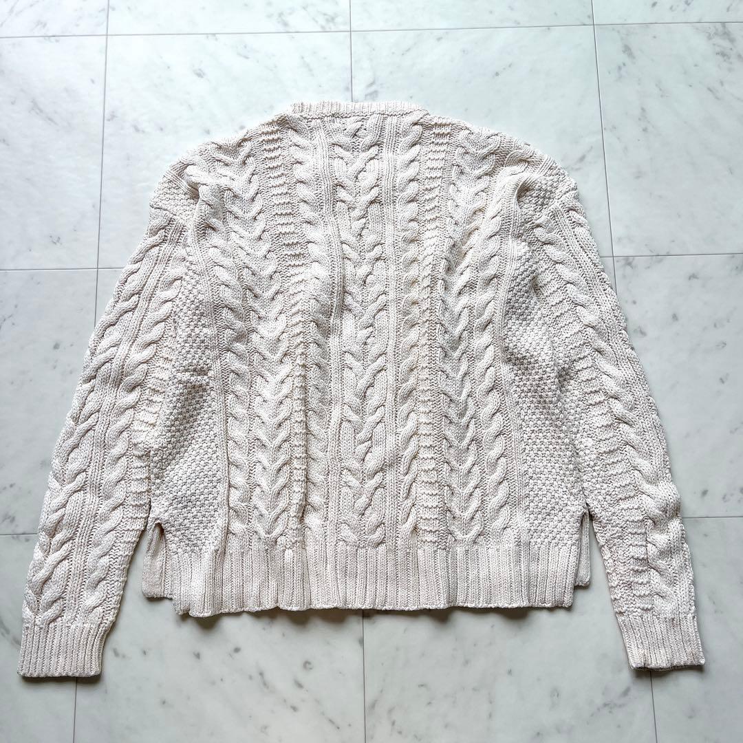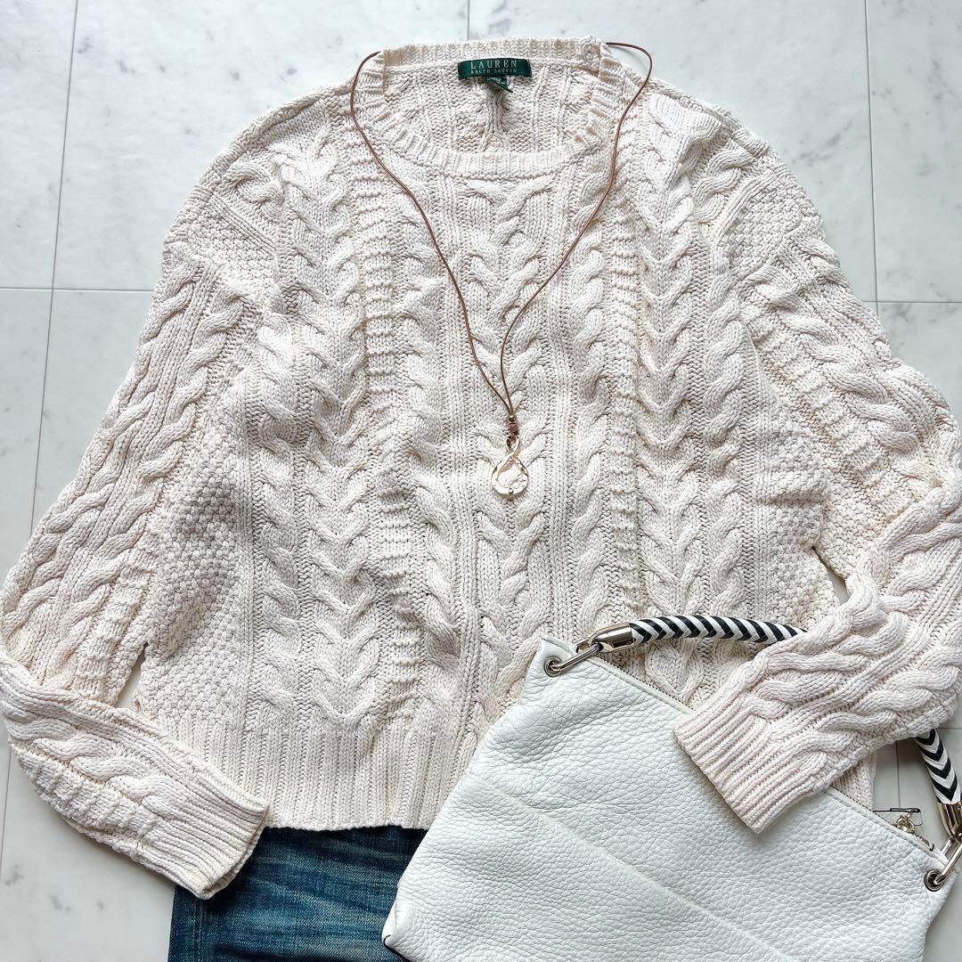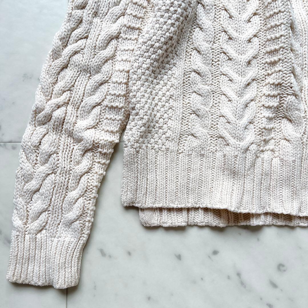 定番のケーブル編みが施された、ざっくりとしたセーターです。