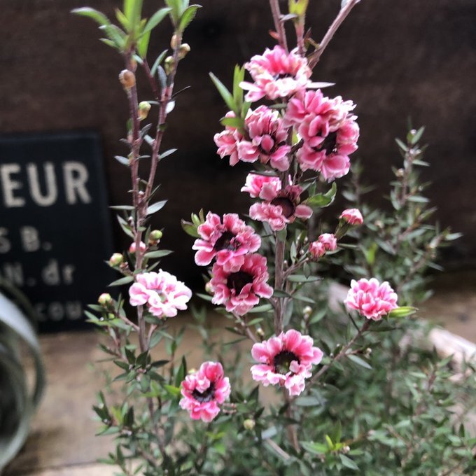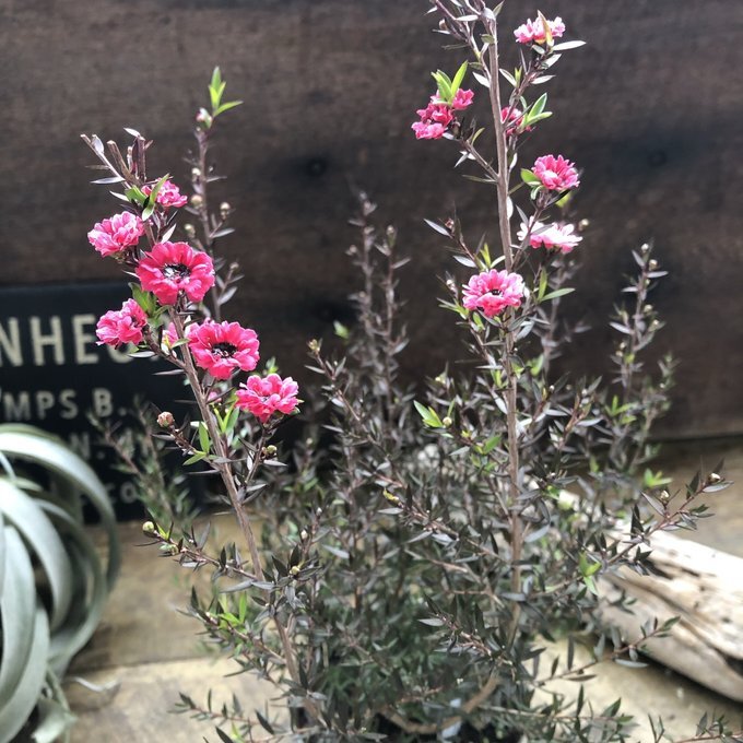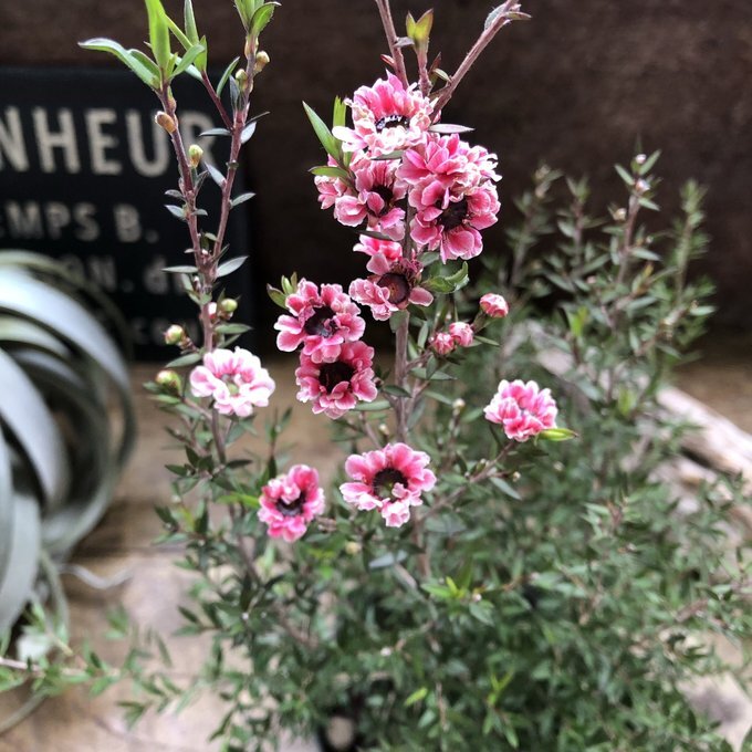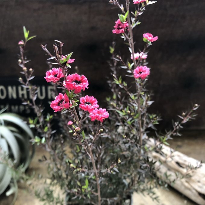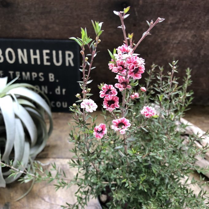 八重咲きのピンクの花をつけた可愛い常緑樹の「ギョリュウバイ」です。