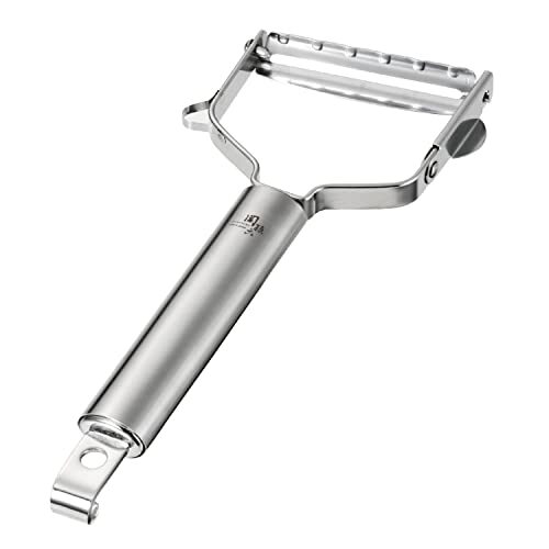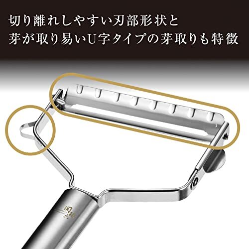 【刀匠 関孫六の伝統から生まれた調理シリーズ】 刃には包丁にも使われているハイカーボン材を使用し、鋭い切れ味が長持ち 刃は掃除しやすい着脱式で、むいた皮が切り離れしやすい形状 芽取りがしやすいU字形状の芽取り付き