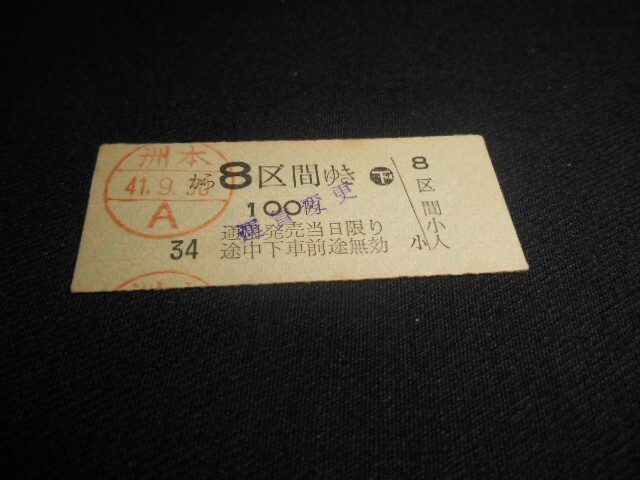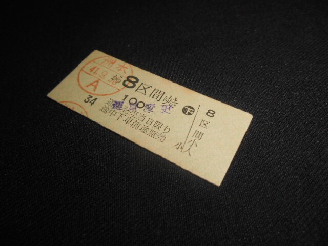 淡路交通 半硬券 洲本から8区間 100円 運賃変更印 昭和41年 送料85円