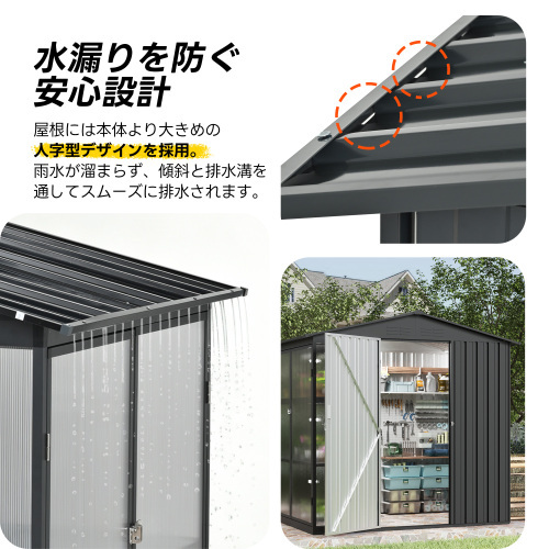 • ◎04【浸水を防ぐ安心設計】屋根には本体より大きめの人字型デザインを採用。雨水が溜まらず、傾斜と排水溝を通してスムーズに排水されます。内部への浸水を防ぎ、大切な収納物をしっかり守ります。