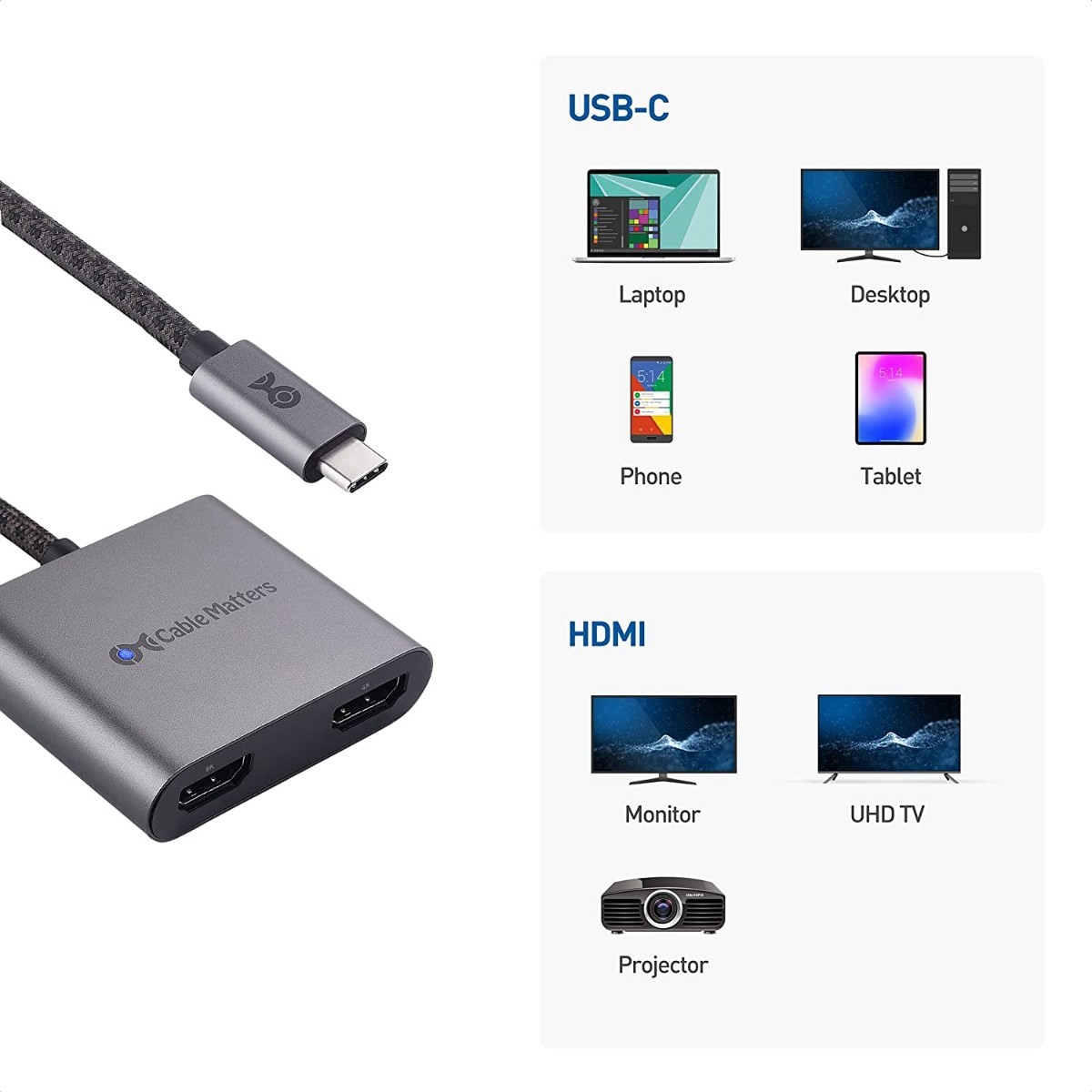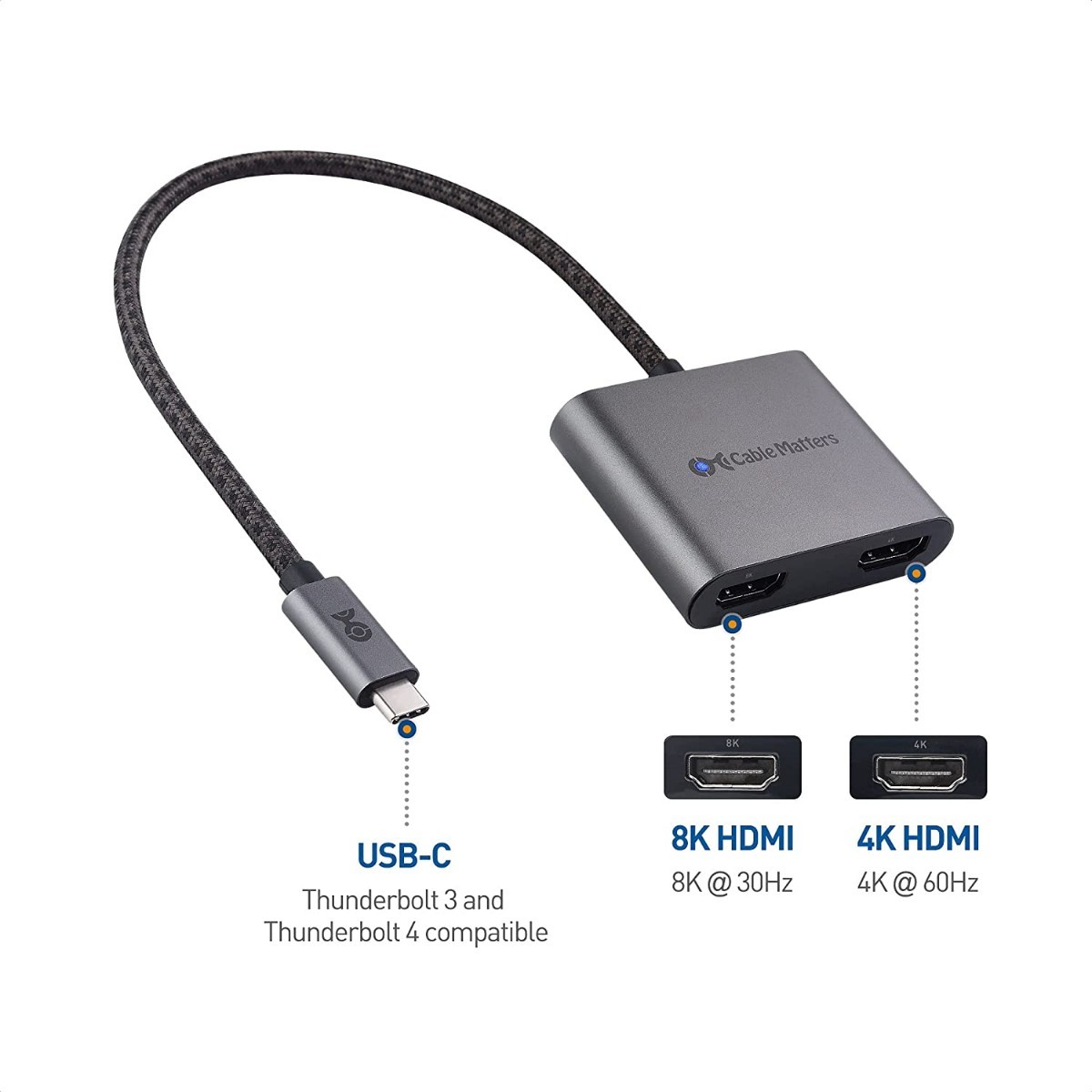 Cable Matters USB-C デュアル HDMI 変換アダプタを使用して、単一のUSB-Cポートをビデオパワーハウスに変換します。 この便利なアダプターは、HDMI2.1に準拠され、シングル8Kディスプレイまたはデュアル4Kディスプレイのいずれかをサポートします。 家庭やオフィスに最適なハイテクアクセサリーです。