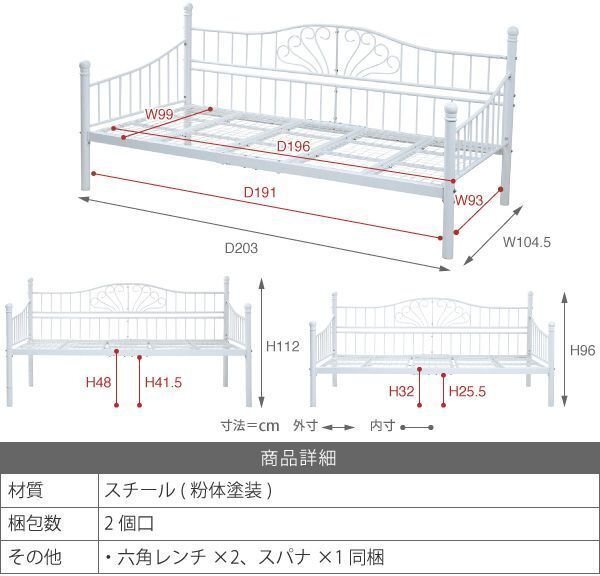 | 【カラー】 ブラック、ピンク、ホワイト 【サイズ】 <外寸> 幅104.5×奥行203×高さ(ハイ時)112(ロー時)96cm <内寸> 床面:幅99×奥行196×高さ(ハイ時)48(ロー時)32cm サイドガード:幅74×高さ37cm 床下:幅93×奥行191×高さ(ハイ時)41.5(ロー時)25.5cm 【材質】 本体:スチール(粉体塗装) 【耐荷重】 床面:(約)120kg以下 【生産国】 中国 【梱包】 2梱包でお届けします。 2-1 サイズ:105×42×14 cm、重量:14.1kg 2-2 サイズ:101×38×18cm、重量:20.4kg 【その他】 ・六角レンチ:2個 ・スパナ:1個 【組み立て品】 お客様による組み立てが必要です。 |