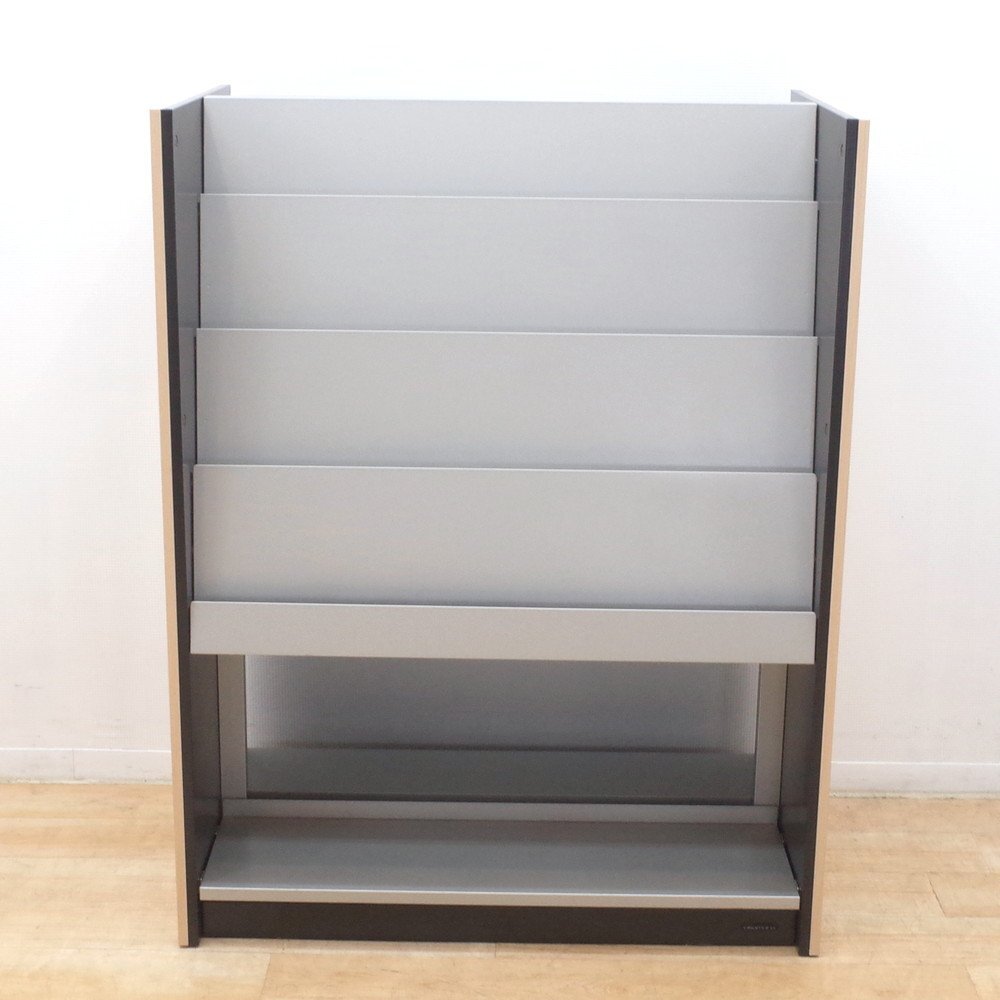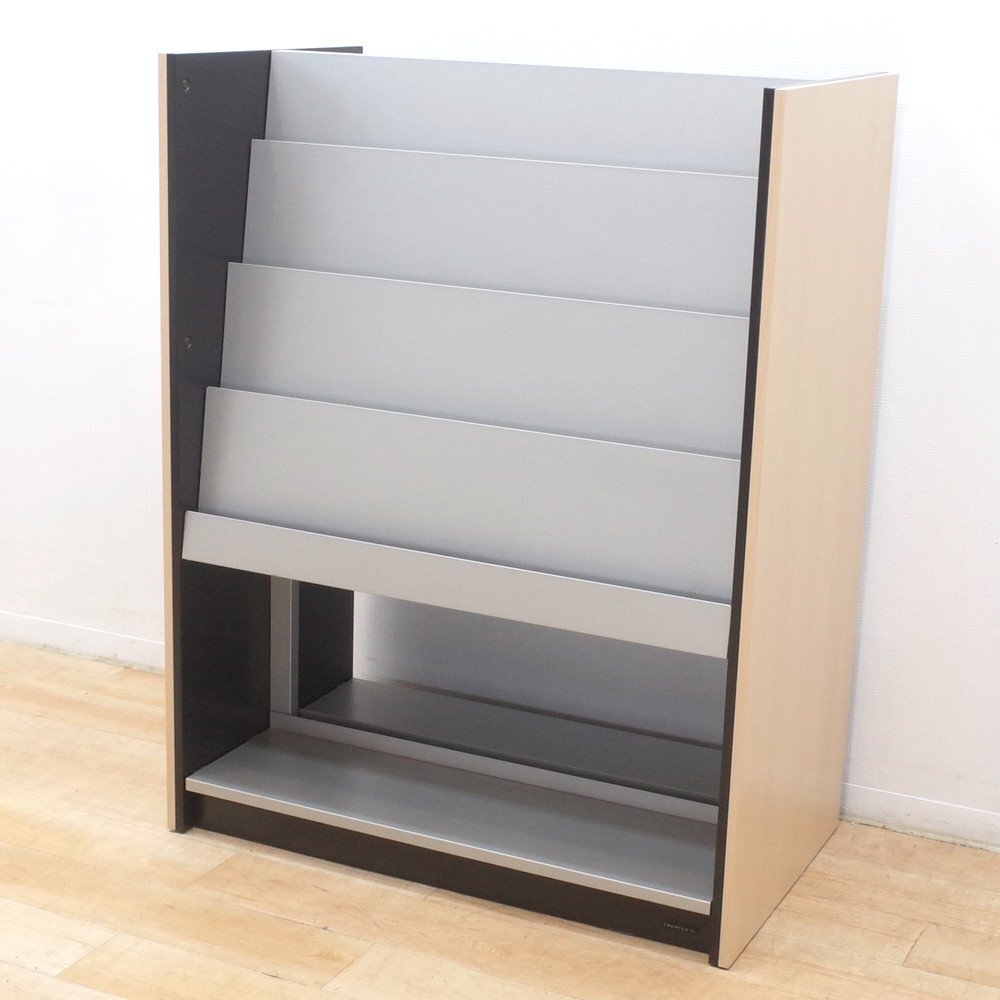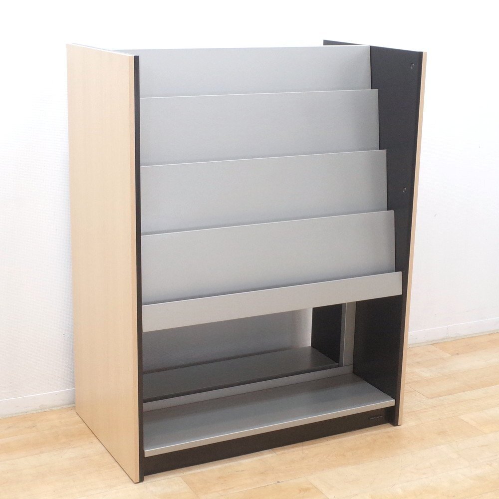 オカムラのマガジンラックが入荷いたしました。 正面がシルバー、側面がナチュラルな木目調のカラーのマガジンラック。 上段が4段のディスプレイ棚、下段がオープン棚になっています。 A4サイズのカタログを4冊並べてディスプレイできる上段。 下段はA4サイズを立てて収納することができます。 両面使用可能で、雑誌やカタログを豊富に収納できるラックです。 カタログやリーフレットをたくさん取り扱う展示場や、待合室などにいかがでしょうか。 |