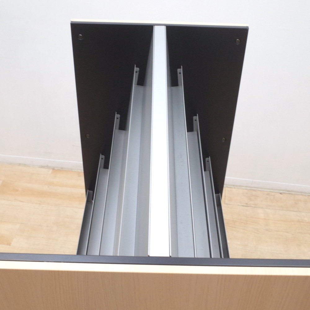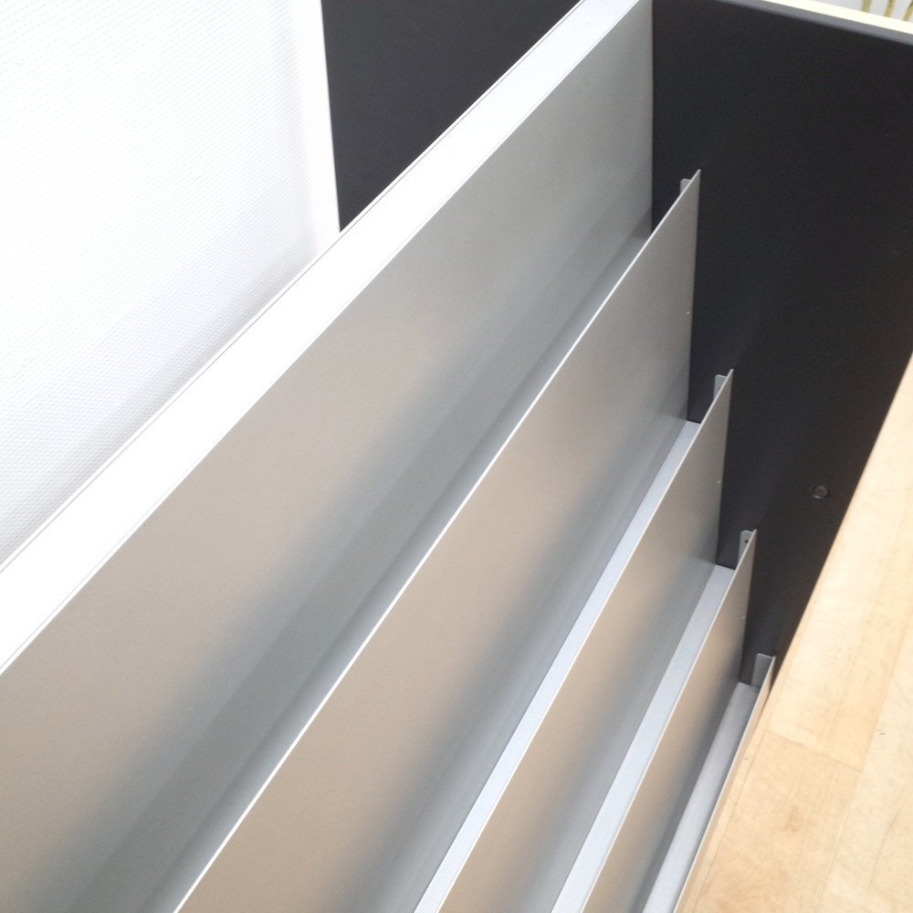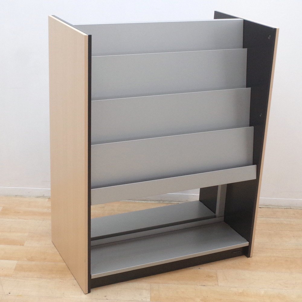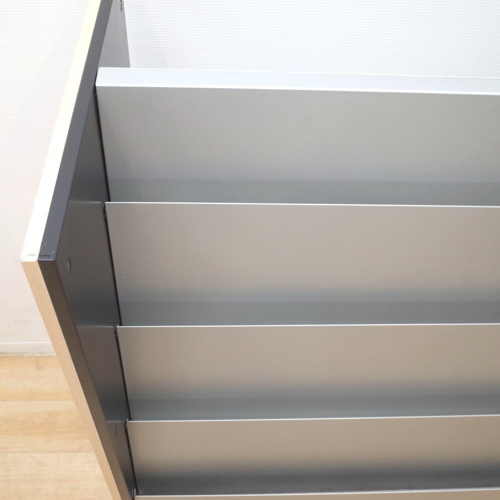 オカムラのマガジンラックが入荷いたしました。 正面がシルバー、側面がナチュラルな木目調のカラーのマガジンラック。 上段が4段のディスプレイ棚、下段がオープン棚になっています。 A4サイズのカタログを4冊並べてディスプレイできる上段。 下段はA4サイズを立てて収納することができます。 両面使用可能で、雑誌やカタログを豊富に収納できるラックです。 カタログやリーフレットをたくさん取り扱う展示場や、待合室などにいかがでしょうか。 |
