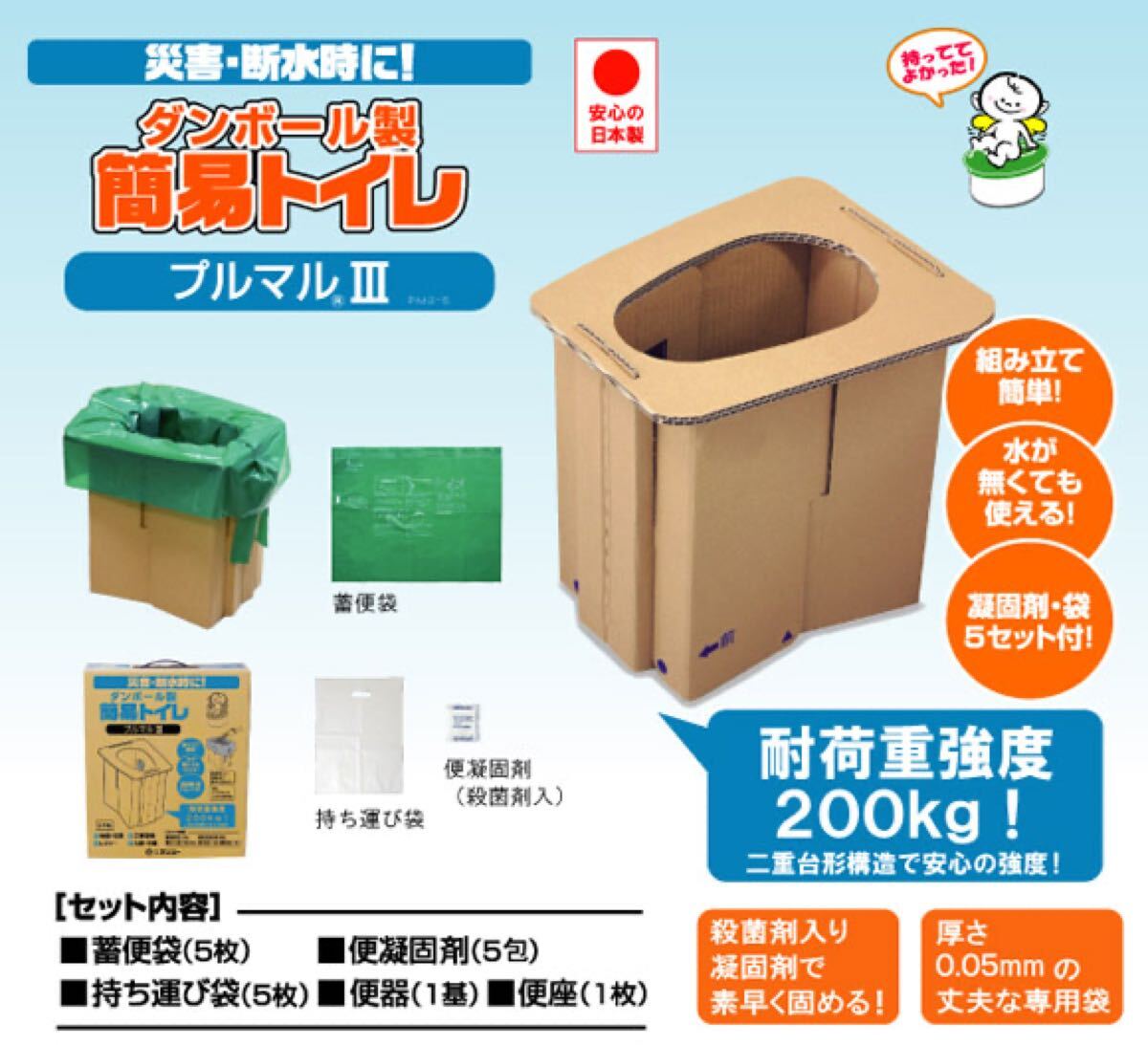災害・断水時に役立つ**ダンボール製の簡易トイレ「プルマルⅢ」です。プルマルⅢは水がなくても使える凝固剤・袋5セット付きで、耐荷重強度は200kgを誇ります。 地震・災害時だけでなく、工事現場、入院・介護、レジャーなど様々なシーンでご活用いただけます。