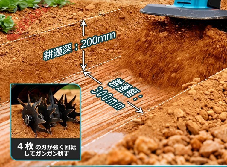 | 使いやすさに配慮した設計で、女性や田舎暮らしを始める定年後の方に最適。エンジン式よりも音や排気ガスが出ないので、住宅地の庭でも安心して使える。燃料やオイル交換不要でメンテ簡単。家庭菜園、農園、ビニールハウス、ガーデンなどで土を掘る作業に役立つ。電源がない場所や延長ケーブルが足りない現場でも便利。充電式なので、どこでも持ち運べます! |