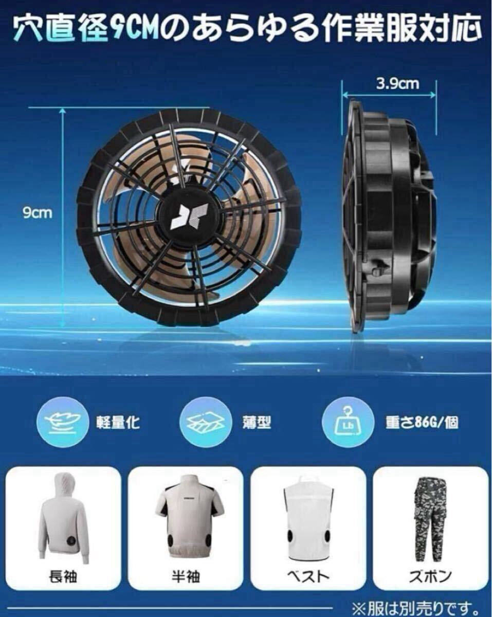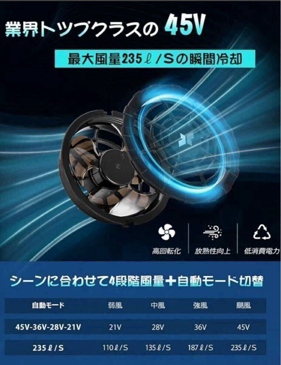 上質な高密度ABS素材、高性能日本製ブラシレスモーターを採用し、圧倒的な省エネ性能を実現しています、回転音が気にならない静音設計です。空調ウェアの付属のファンは最多の3枚羽タイプを使用し、風力がパワフルなのに静音でストレスフリーの心地良い風を生み出します。2種類風量モード(自動モードと固定モード)が搭載され、ワンボタンで21V-28V-36V-45V-Autoに5段階切り替えるだけでなく、同類製品に比べると45V最強風量モードでもパワーが一定で、風量が弱くならないでずっと235/秒で服内に暴風を送り、空気循環をすばやく強化し、体温を下げます。