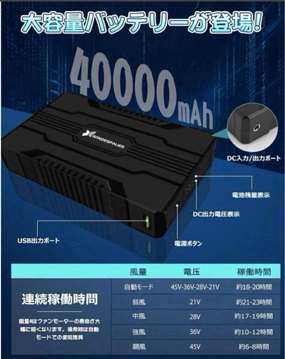 電気自働車で広く使われている21700型バッテリーを採用し、より高い容量、改善された電力供給、優れた熱性能、およびより長いサイクル寿命を提供します。空調服用の専用急速ACアダプターを付属し、わずか7時間で充電できます。「自動モード」の使用時間は約18-20時間、「45V」風力は6-8時間、「36V」風力は10-12時間、「28V」風力は17-19時間、「21V」風力は21-23時間、従来の使用時間に比べて大幅にアップしました!長時間仕事をしていても常に涼しい風を感じることができます。炎天下での作業時に体感温度を最適化にすることで、実用性と便利性を兼ね備えた空調 ファンです。(※上記の使用時間は特定環境での数値となります。実際のご使用時間と異なる場合はございます。)