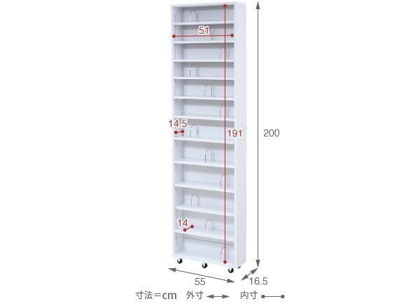 | 幅16.5cmの隙間を埋めてスッキリ収納。 たくさん増えて置き場に悩む、本やメディア類もこれ一台にまとめることができます。 棚板は11枚付いているので、12段の棚を作ることができ、収納の自由度が高い隙間ラックです。 |