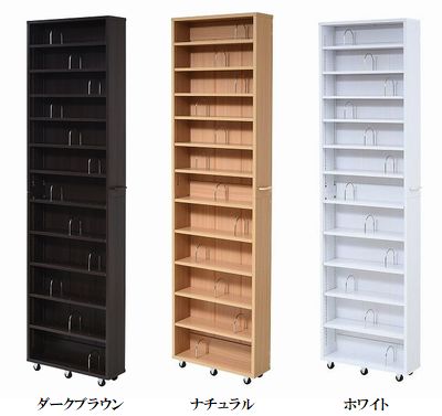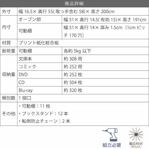 | 【カラー】 ダークブラウン、ナチュラル、ホワイト 【サイズ】 <外寸> 幅16.5×奥行55(取っ手含む58)×高さ200cm <内寸> オープン部:幅51×奥行14.5(有効15)×高さ191cm 可動棚:幅51×奥行14×厚み1.5cm(1cmピッチ170穴) 【材質】 本体:プリント紙化粧合板 【耐荷重】 可動棚:5kg以下 【収納量】 文庫本:(約)308冊 コミック:(約)252冊 DVD:(約)252枚 CD:(約)504枚 Blu-ray:約(約)20枚 【生産国】 ベトナム 【梱包】 サイズ:120.5×23×24.5cm、重量:24.5kg 【その他】 ・可動棚:11枚 ・ブックスタンド:12本 ・転倒防止チェーン:2本 【組み立て品】 お客様による組み立てが必要です。 【ご注意】 ・サイズ、重量は概算です。 ・商品カラーはご使用のモニターによって実際の明るさや色と異なって見える場合がございます。 |
