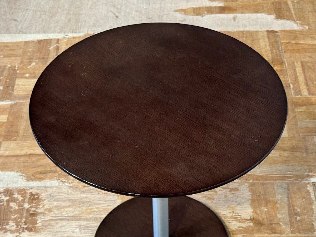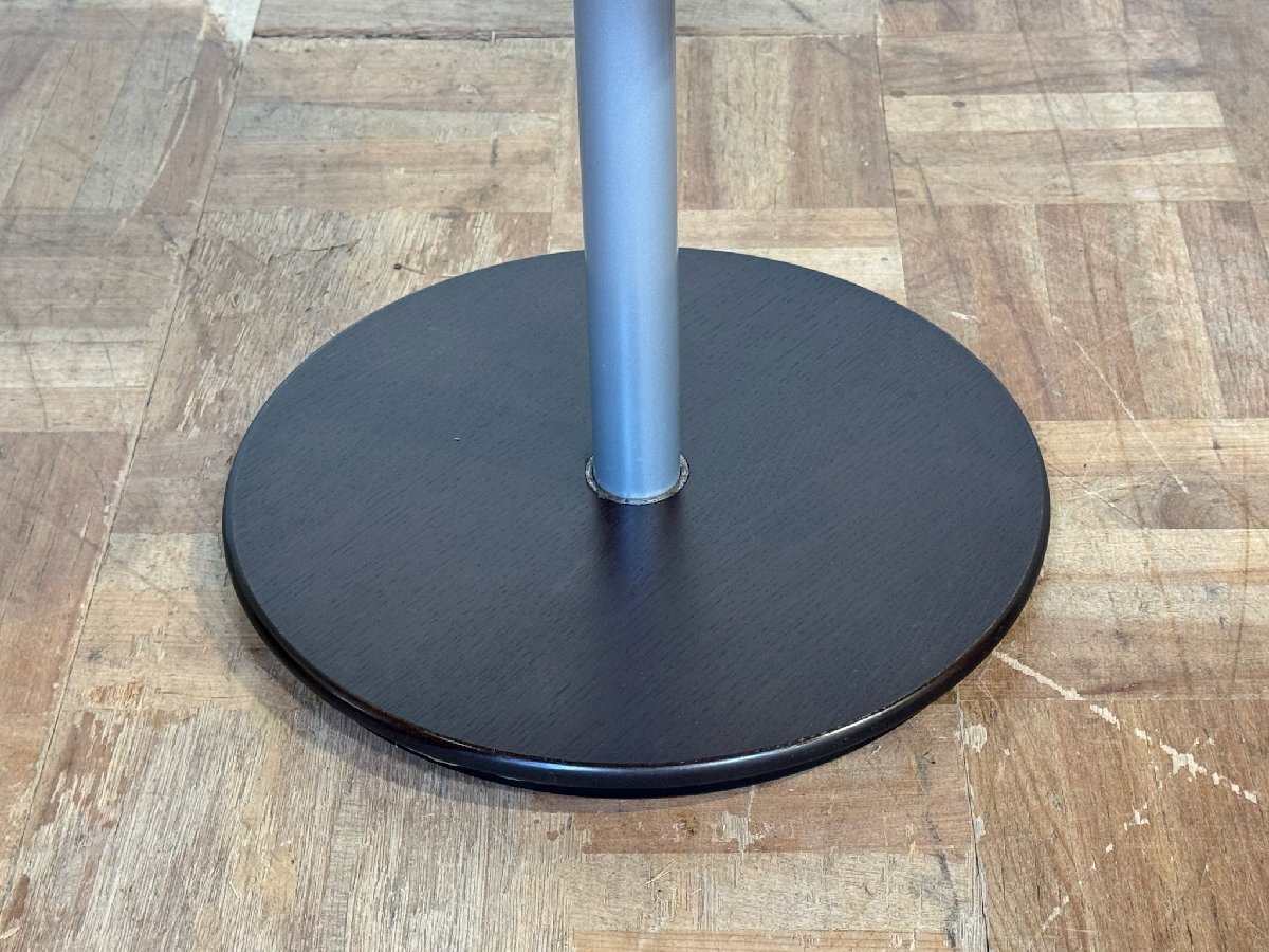 凛とした清楚な雰囲気とブラウンの温かなカラーリング、台座と天板の緩やかなカッティングと、絶妙なバランスで設計されており、ほっそりした支柱の静かなシルバーが禅とした印象を鳴らしています。