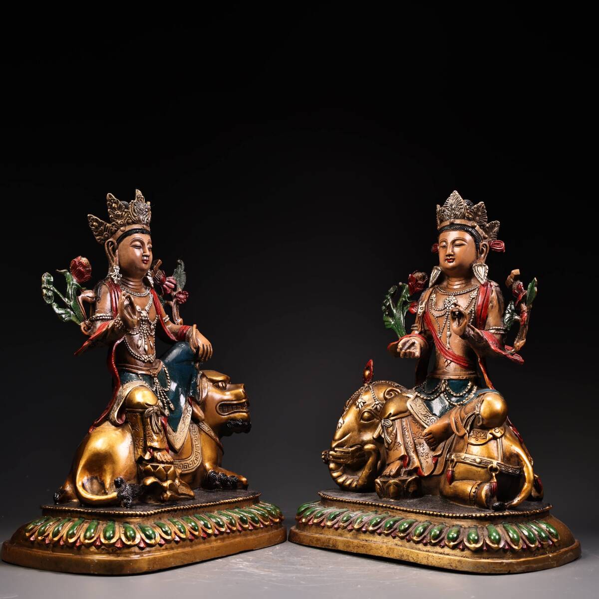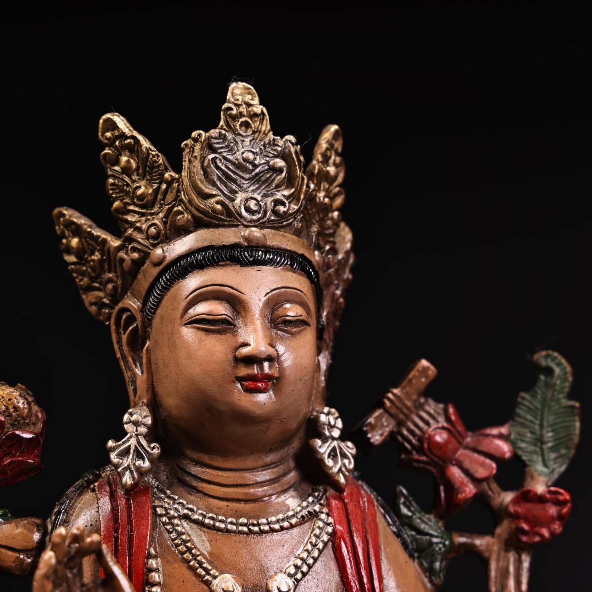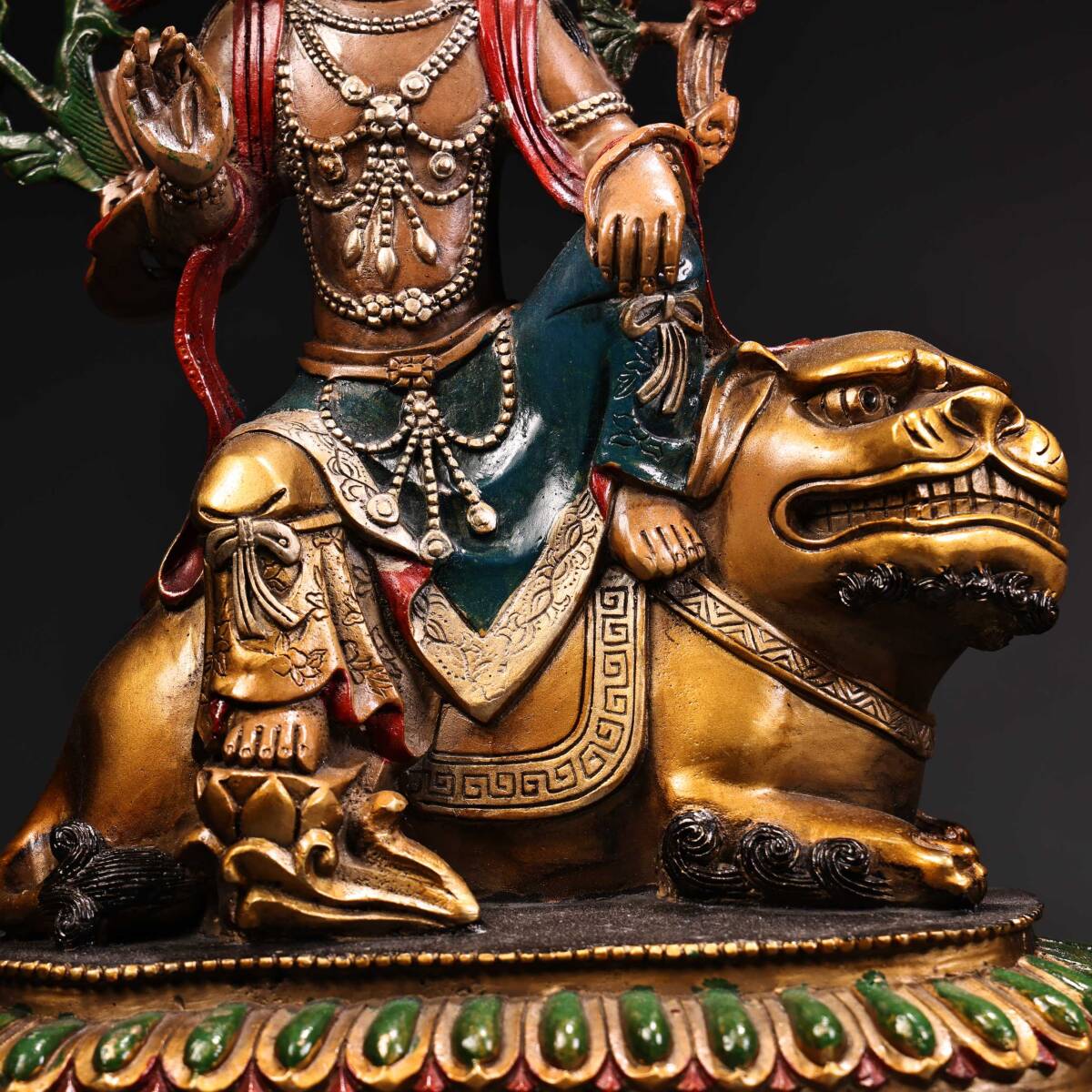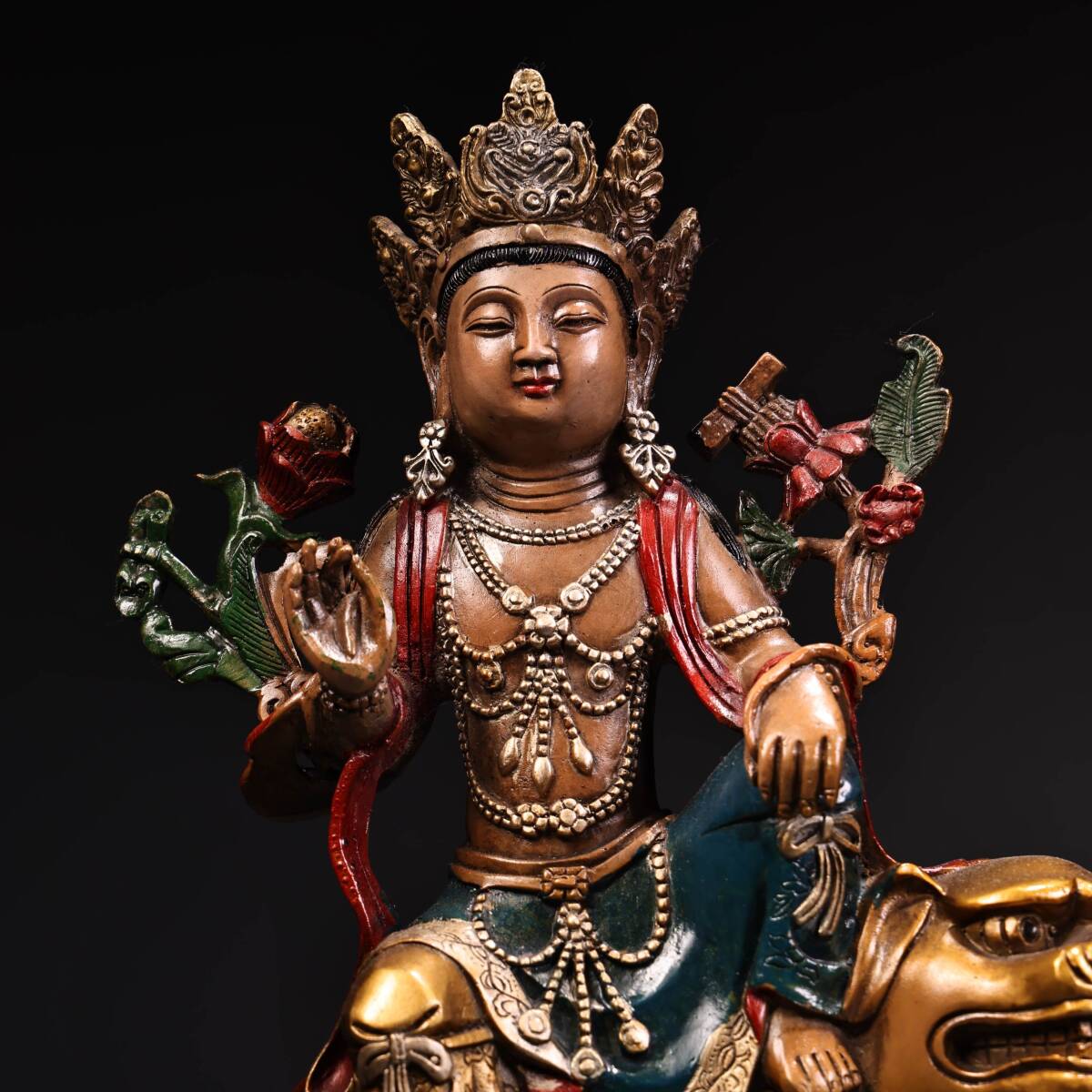 唐物 清 純銅 全銅 彩繪描金文殊菩薩 仏像 奉納されていた 供養品 銅製 銅器 極細工 古美術品 中国古玩 骨董品 D611