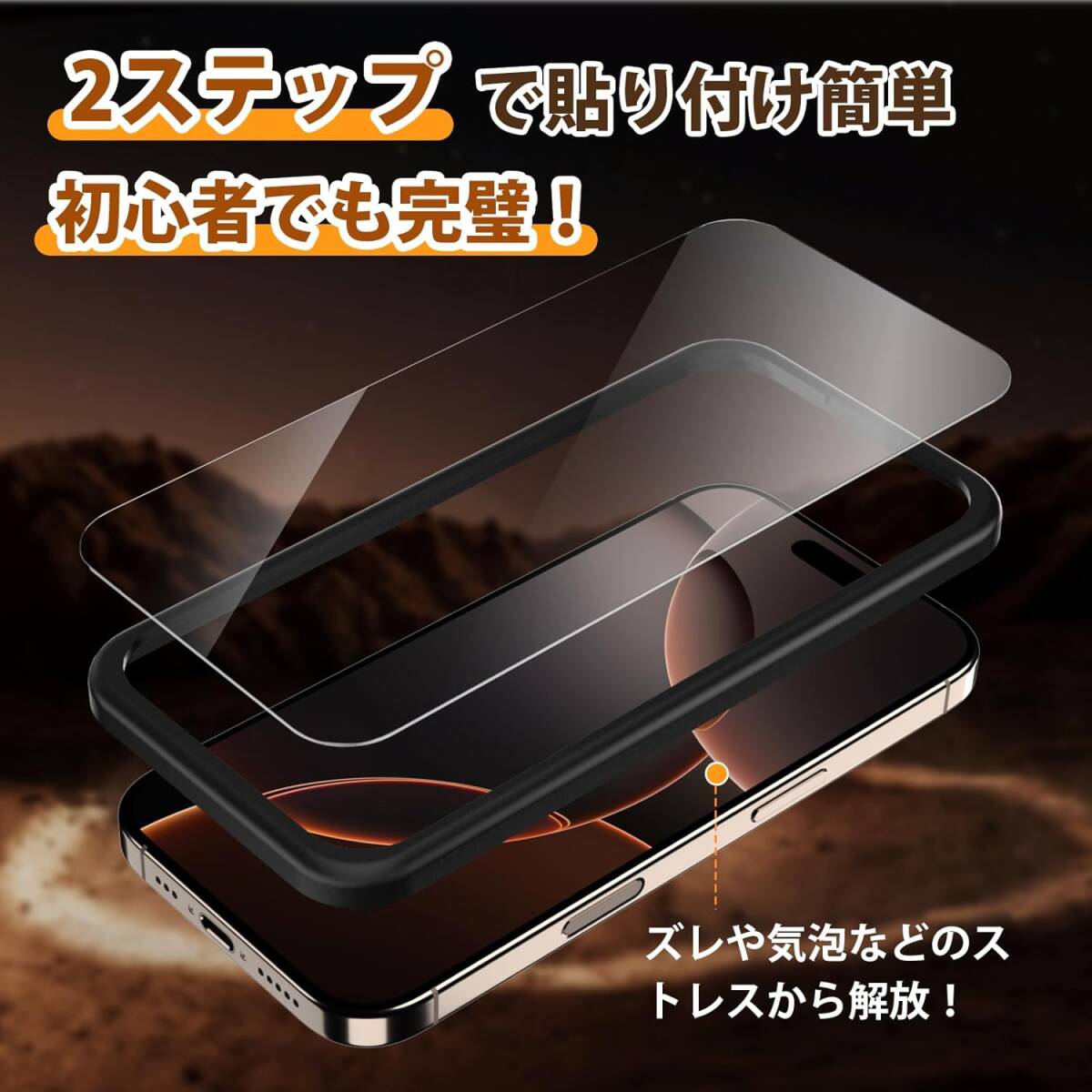 • 【初心者でも完璧!貼り付け簡単】2ステップで、初心者でも完璧に貼り付け可能!画面に置くだけでキレイに貼れ、気泡も抜けやすい。CNC彫刻加工を採用したガイド枠はiPhone 16 Proの画面にぴったりフィットし、ズレなどのストレスから解放!