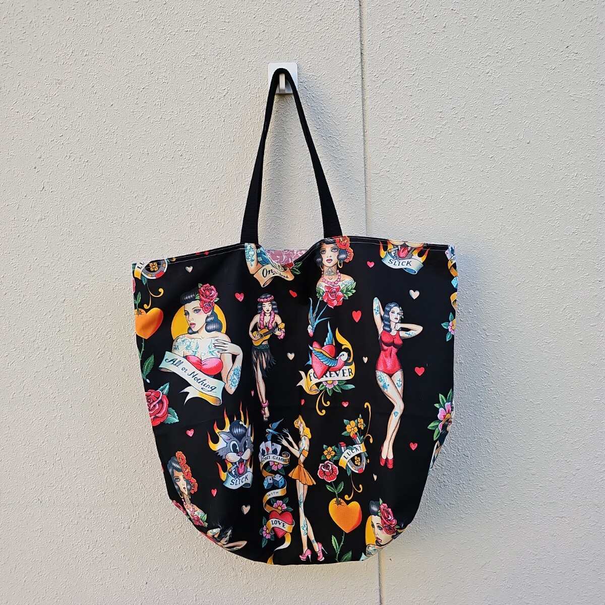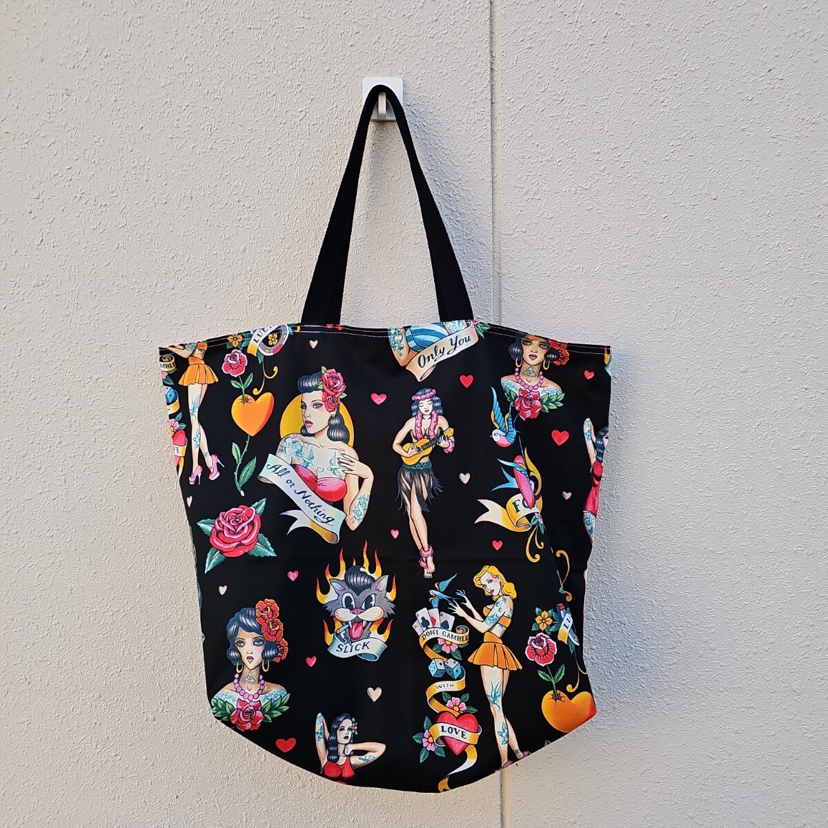 サイズは、高さ39cm、横 上部54cm、底部39cm、マチ15cm、ヒモ57cmです。