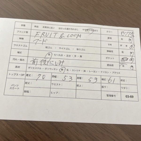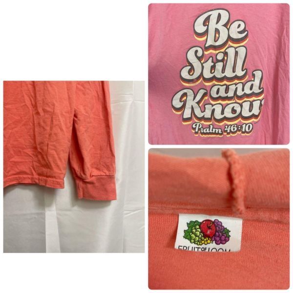 レトロプリントが映える!ゆったり着られるFRUIT OF THE LOOMフーディーカットソー - ブランド:FRUIT OF THE LOOM - サイズ表記:不明(L相当) - 素材:綿(コットン)100% - カラー:コーラルピンク - シーズン:春秋 - 服の特徴:プリントロゴ「Be Still and Know」、フード付き、長袖カットソータイプ - ダメージ・汚れ詳細:前側にしみあり - 袖の長さ:長袖 03-69 即購入大歓迎・お得な割引各種あります 詳しくはプロフィールをご覧ください! 匿名&送料無料 海外輸入のため全て一点ものです 古着のため使用感・毛玉等があることもあります。写真で状態の確認を行なってからご購入ください おまとめ買いでお得な割引あります♪ 平置き採寸表→写真から確認いただけます! (素人採寸のため、多少の誤差はご了承ください) 商品状態に関しては、写真、商品説明欄に記載しております。着用回数、購入時期などはお答えできませんので、ご了承ください。着画、写真の追加もお断りしております。 簡易包装のコンパクト発送となります。 畳みシワはご了承の程、宜しくお願いいたします。 商品によっては圧縮してお送りするものもございます。 撮影環境や使用するモニター、反映されにくい色味など、 商品と画像に若干の色誤差が生じますことをご了承ください。 出品作業の際にしっかりと確認はしておりますが、シミなどの見落としがある場合もございますのでご了承下さい。 古着の取り扱いになりますので特有の匂い等がある可能性があります。ご理解のある方のみご購入の程お願い致します。
