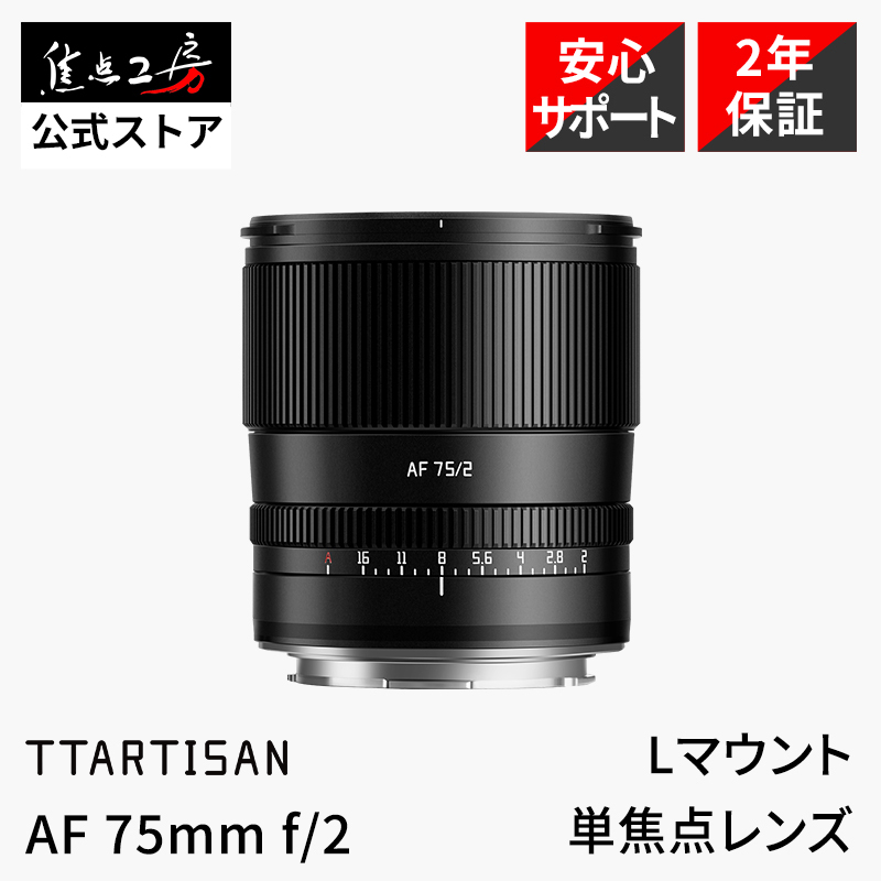銘匠光学(めいしょうこうがく)TTArtisan AF 75mm f/2は、フルサイズセンサー対応の単焦点レンズです。EDレンズ1枚と高屈折レンズ4枚を含む7群10枚のレンズ構成により、色収差や歪みを抑えた良好な画質を実現しました。金属製の鏡筒は耐久性に優れ、上質な見た目と手触りを提供します。また、クリック感のある絞りリングが付いており使い勝手にも優れています。 ポートレート撮影に最適 開放F値2.0の明るさは、被写体を美しく際立たせるような自然で滑らかなボケを生み出し、夜間や屋内などの暗い環境下でもノイズやブレを抑えて撮影することが可能。75mmの焦点距離は、全身・バストアップどちらの撮影にも使いやすく、ポートレートやストリートスナップなど人物の撮影に最適です。また、優れた光学設計により、肌の質感から衣類の細部に至るまで鮮明に映し出します。/p> シャッターチャンスを逃さないAF対応レンズ STM(ステッピングモーター) + リードスクリュータイプの駆動方式を採用し、快適なオートフォーカスを実現。静音性にも優れているため動画撮影時にも活躍します。また、顔検出/瞳AFなど各種被写体検出にも対応し、被写体の表情や動きを素早く捉えます。 ファームウェアアップデートに対応 リアキャップにはUSB端子を設けており、PCと接続してファームウェアアップデートが行えます。 レンズ構成(7群10枚)/MTF図 動画 仕様