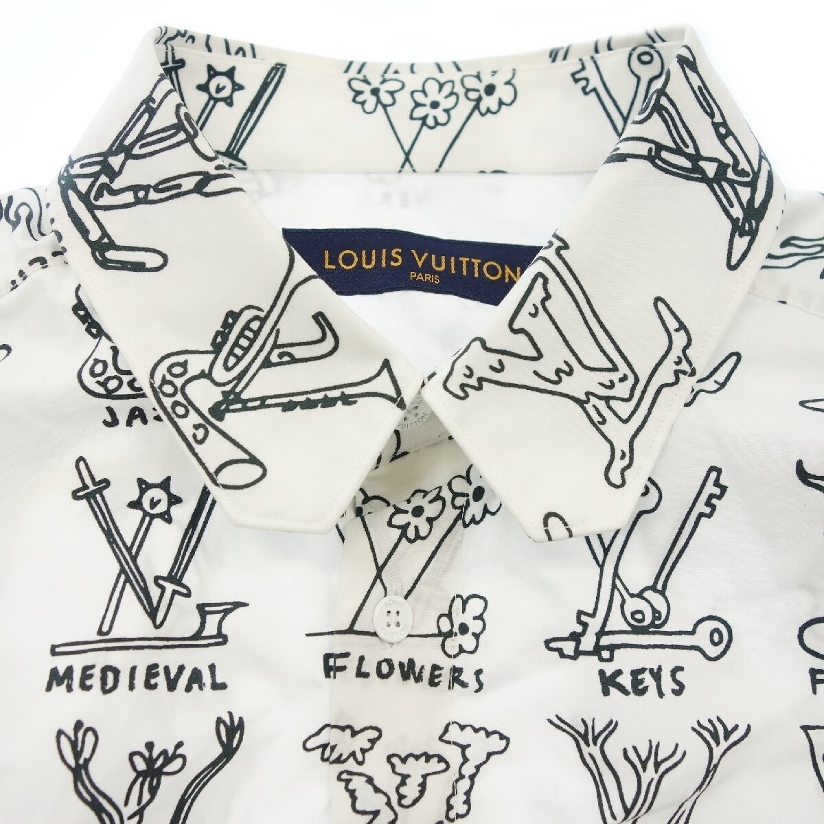 新品未使用品、サイズXL 、カラーホワイト×ブラック、素材コットン100%、肩幅50、身幅58、着丈78、袖丈65、今シーズンならではのLV カートゥーンパターンをあしらったエレガントなドレスシャツ、スリムフィットに仕立て織り上げたインサイドアウト風のLV ラペル総柄、とてもお洒落でカッコいい商品、タグ番号RM211M ZIU HKS17W、(注)クローゼット保管品につき少し目立たない薄い汚れがありますが着用には問題ありません。