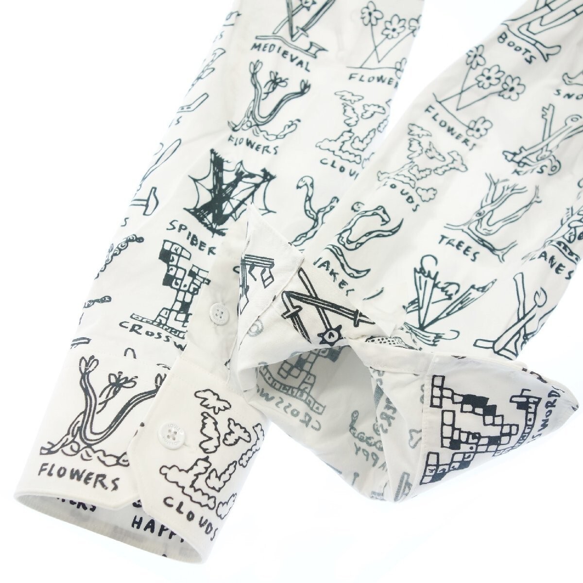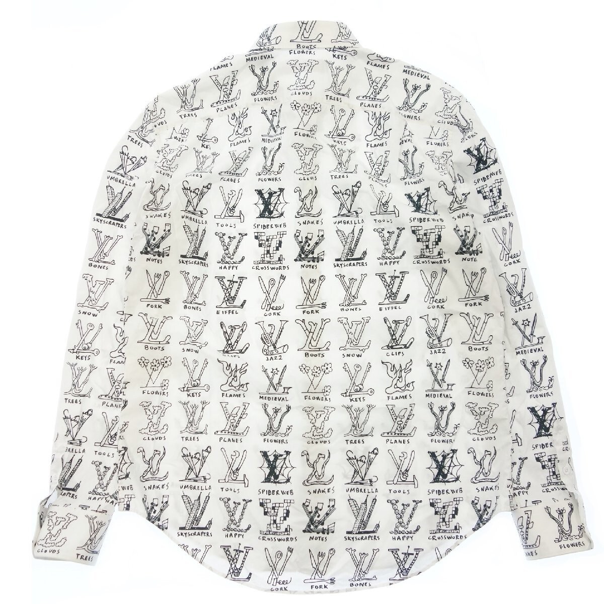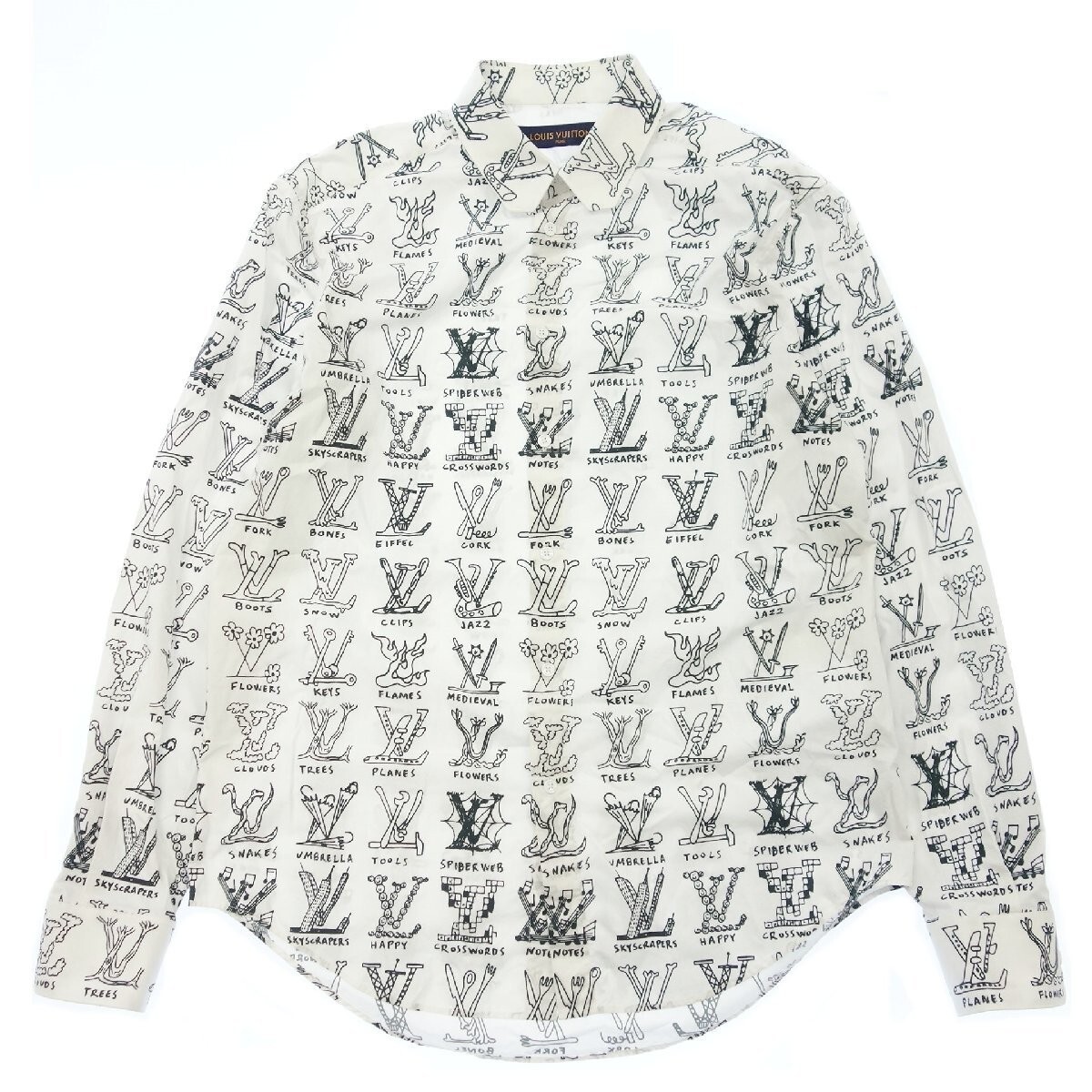 新品未使用品、サイズXL 、カラーホワイト×ブラック、素材コットン100%、肩幅50、身幅58、着丈78、袖丈65、今シーズンならではのLV カートゥーンパターンをあしらったエレガントなドレスシャツ、スリムフィットに仕立て織り上げたインサイドアウト風のLV ラペル総柄、とてもお洒落でカッコいい商品、タグ番号RM211M ZIU HKS17W、(注)クローゼット保管品につき少し目立たない薄い汚れがありますが着用には問題ありません。