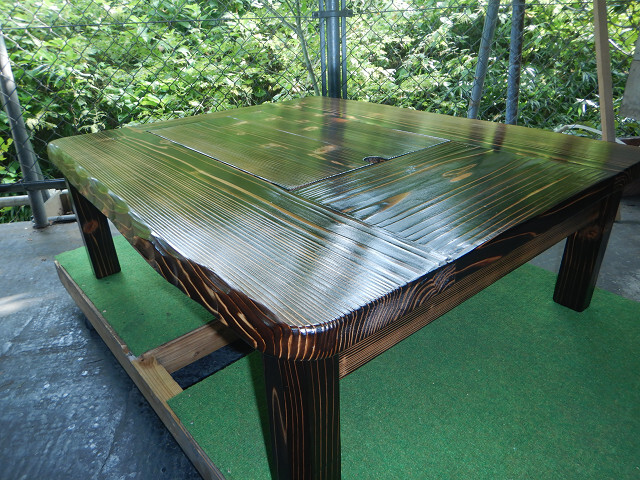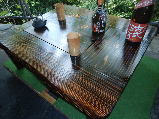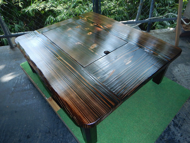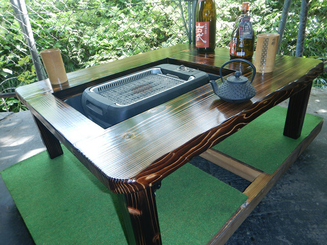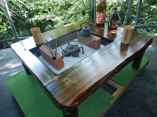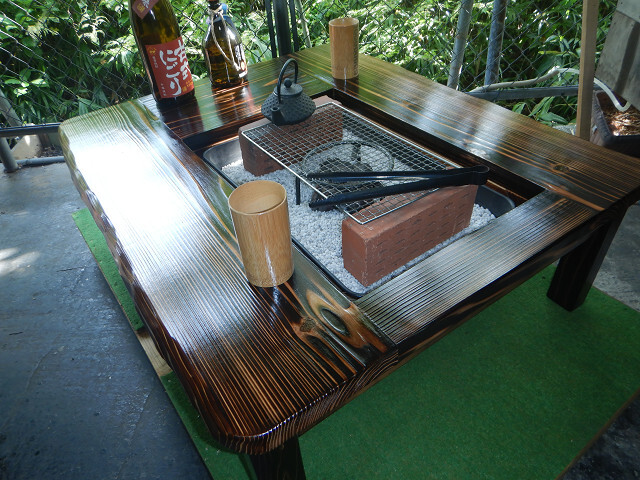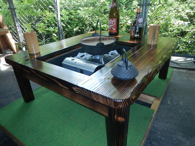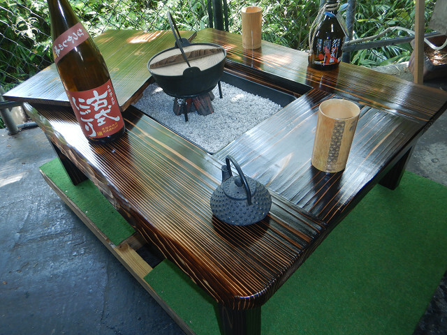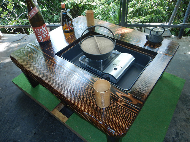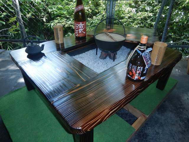 囲炉裏テーブル「E-643」軽量片方を広く料理スペース・ おこぜ夢工房の田舎作り一点物 「送料無料」