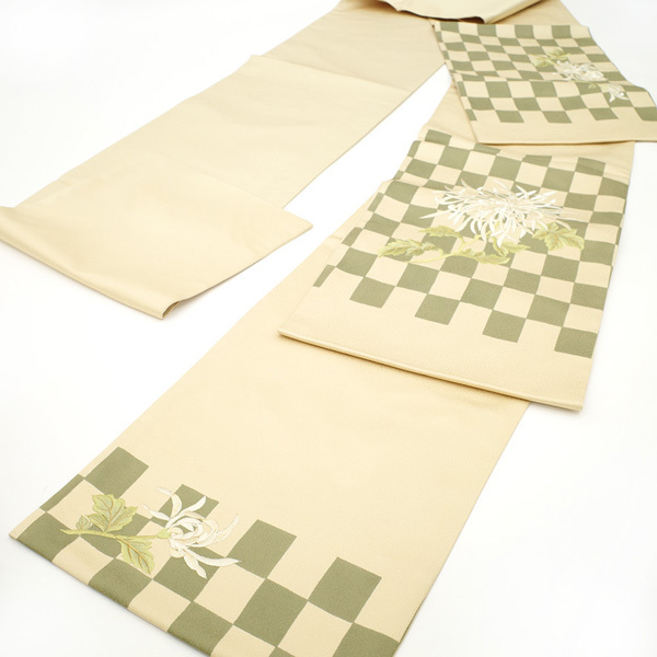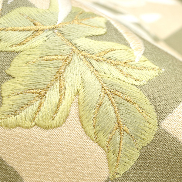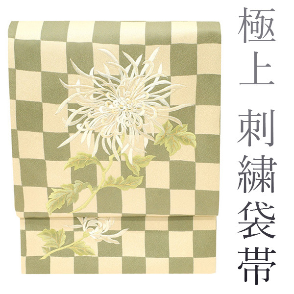 30%OFFで¥54780→38346 袋帯 極上 刺繍 金糸 ベージュ 松葉色 市松 菊 カジュアル 新古品 仕立て上がり みやがわ sb50457