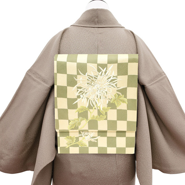 カジュアリーな市松にエレガントな菊の刺繍が相まった素敵な 袋帯 です。