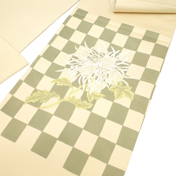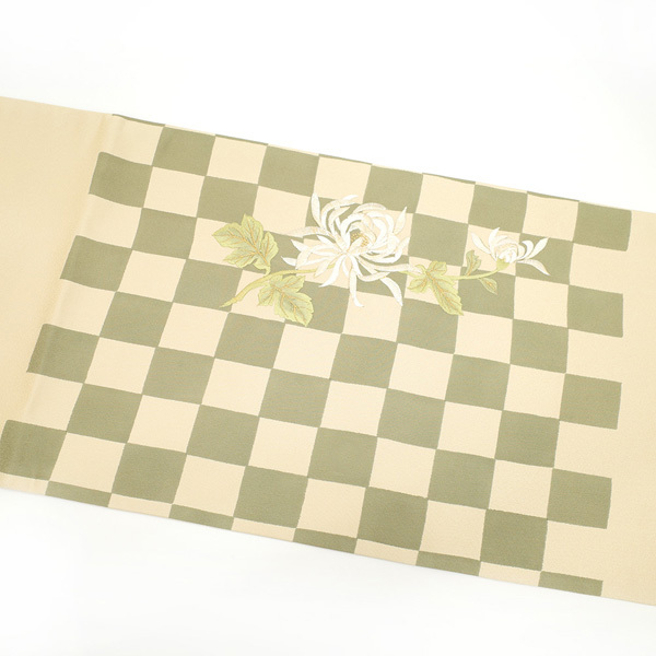 【新古品】 袋帯 極上 刺繍 正絹 絹 金糸 ベージュ 松葉色 市松 菊 カジュアル ちょっとしたお出かけや集まりにも ショッピング お食事 観劇など 袋帯 帯 販売 購入 美品 リサイクル 綺麗 未使用 新古品 仕立て上がり みやがわ sb50457