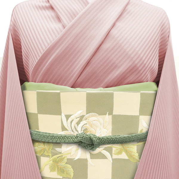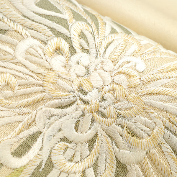 お太鼓や前帯部分に菊の刺繍が飾られています。