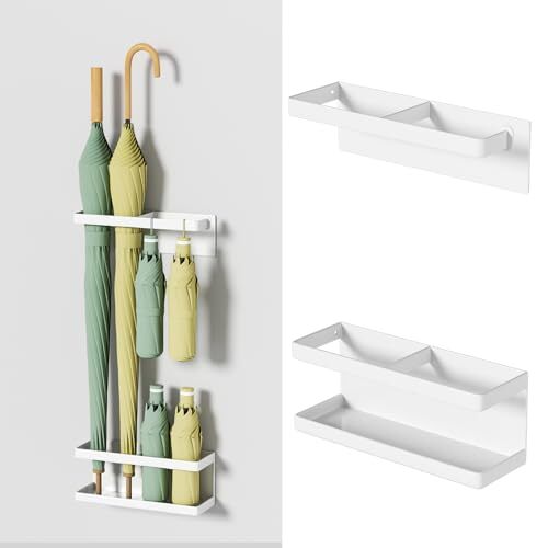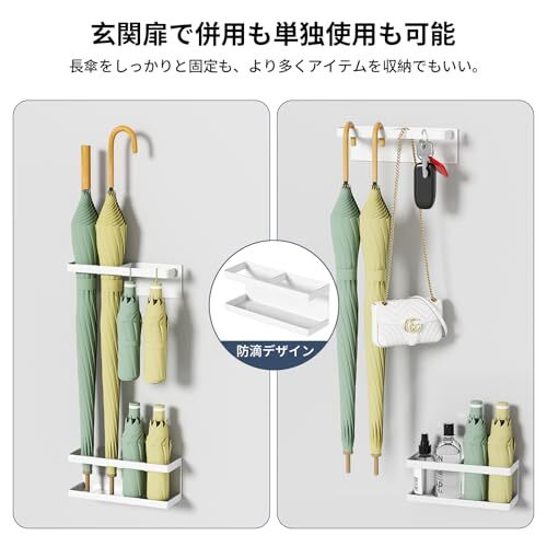 【マグネット傘立て】玄関のドアに取り付けて、傘を簡単に収納できます。ラックは防滴設計で、水が流れて床が濡れる心配もありません。鍵やタオルを簡単に整理できる吊り棚も付いています。これさえあれば、玄関ホールがすっきりきれいになります。