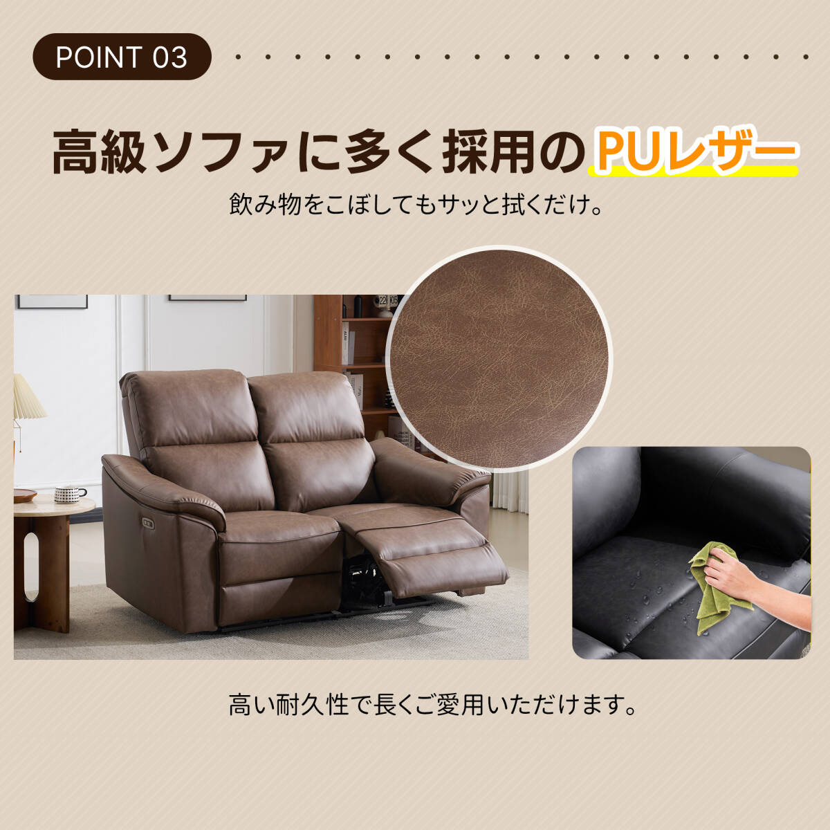 • ◎5【高級ソファに多く採用のPUレザー】飲み物をこぼしてもサッと拭くだけ。 高い耐久性で長くご愛用いただけます。