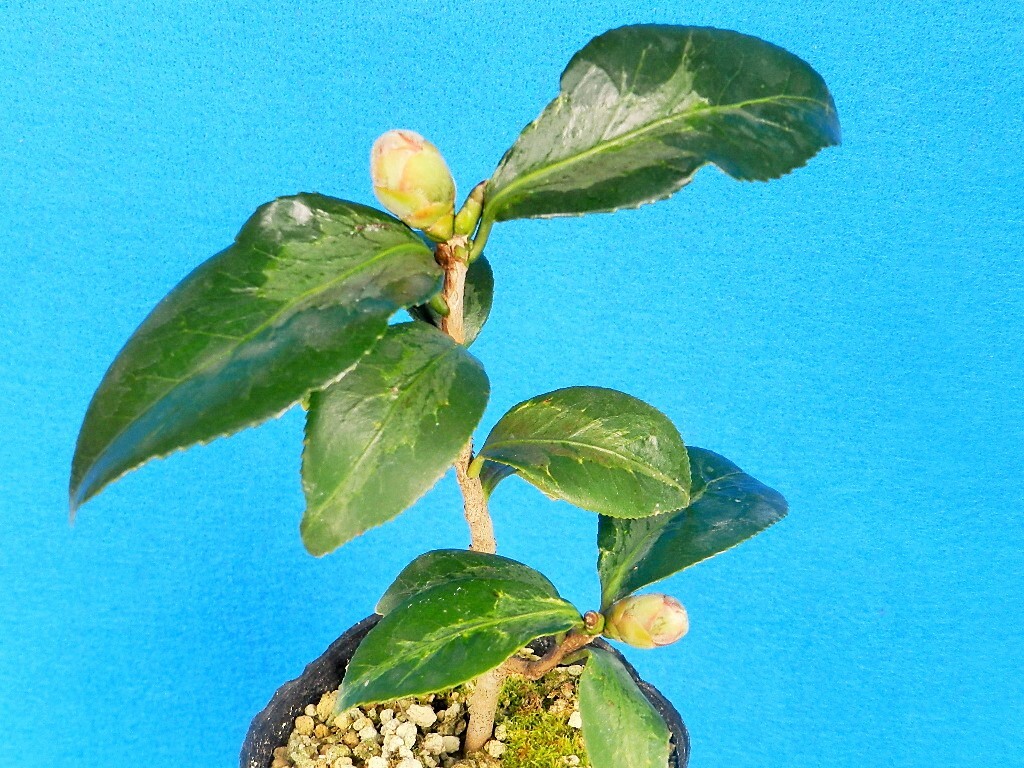 斑入(銀ノリ三光中斑) ツバキ[金魚椿の斑] 蕾付き・珍品・花木・山野草・椿