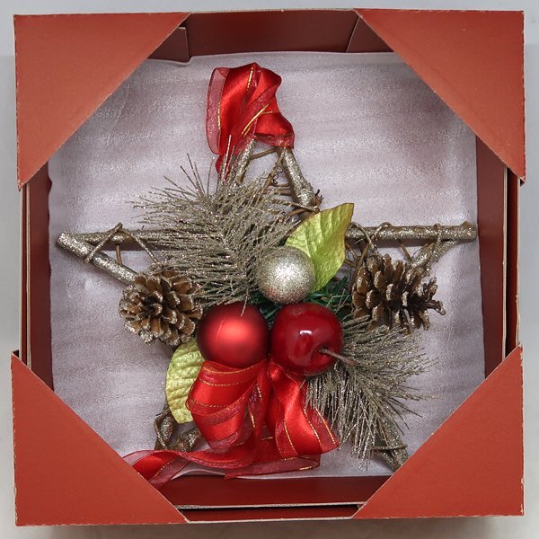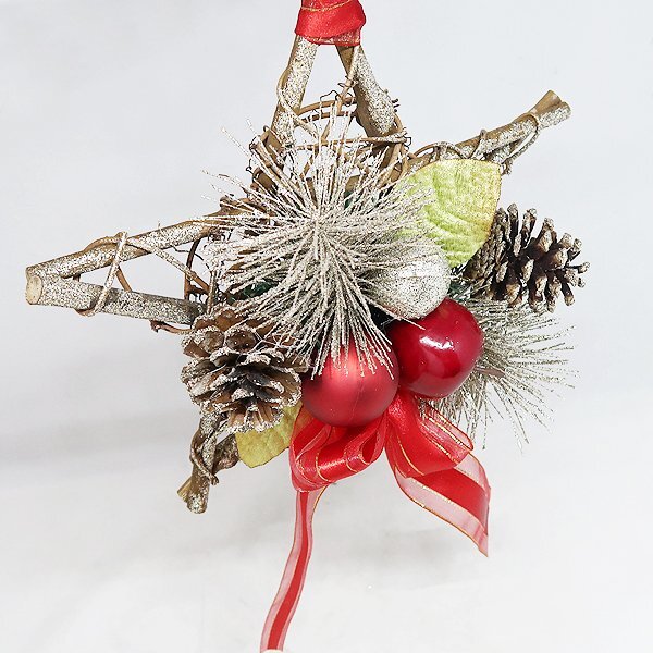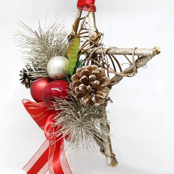 星形のリース本体にレッドやゴールドなど華やかなカラー使いで賑やかなデザインに仕上げています。