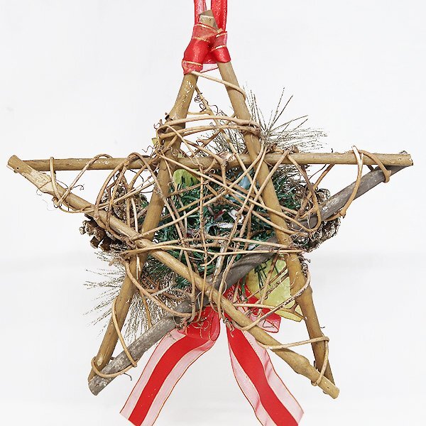 星形リースの中央に華やかなオーナメントをあしらった、おしゃれなリースです。