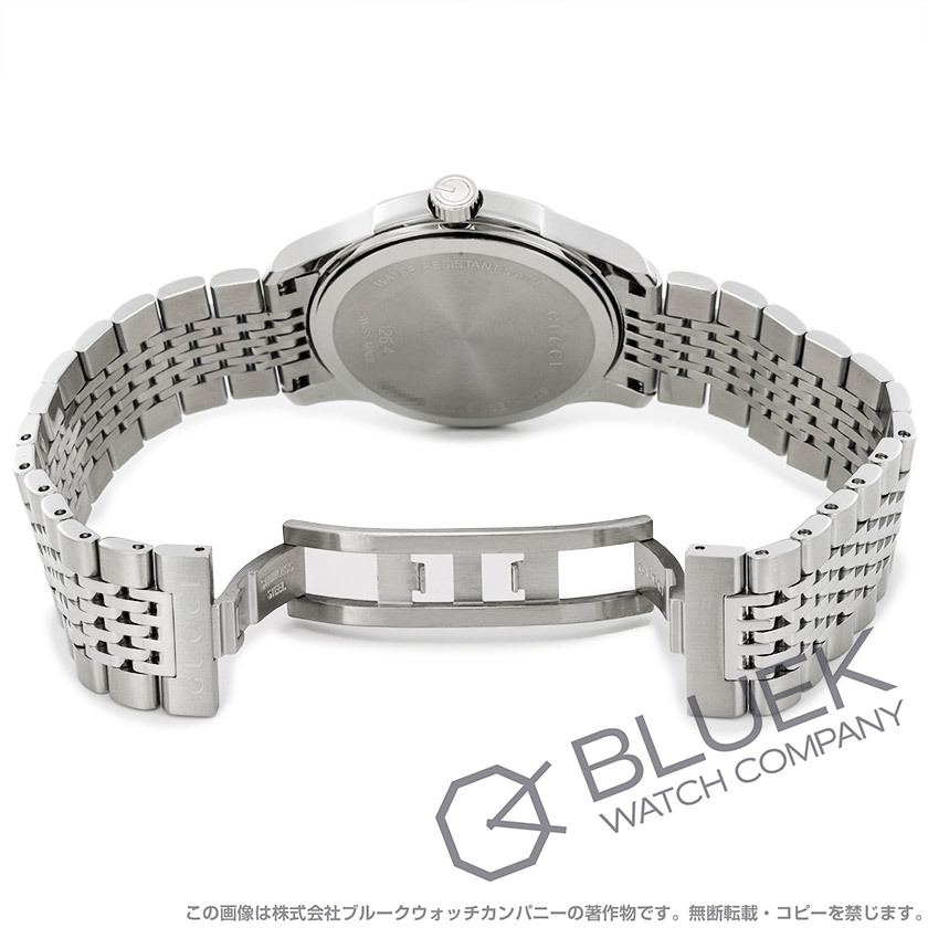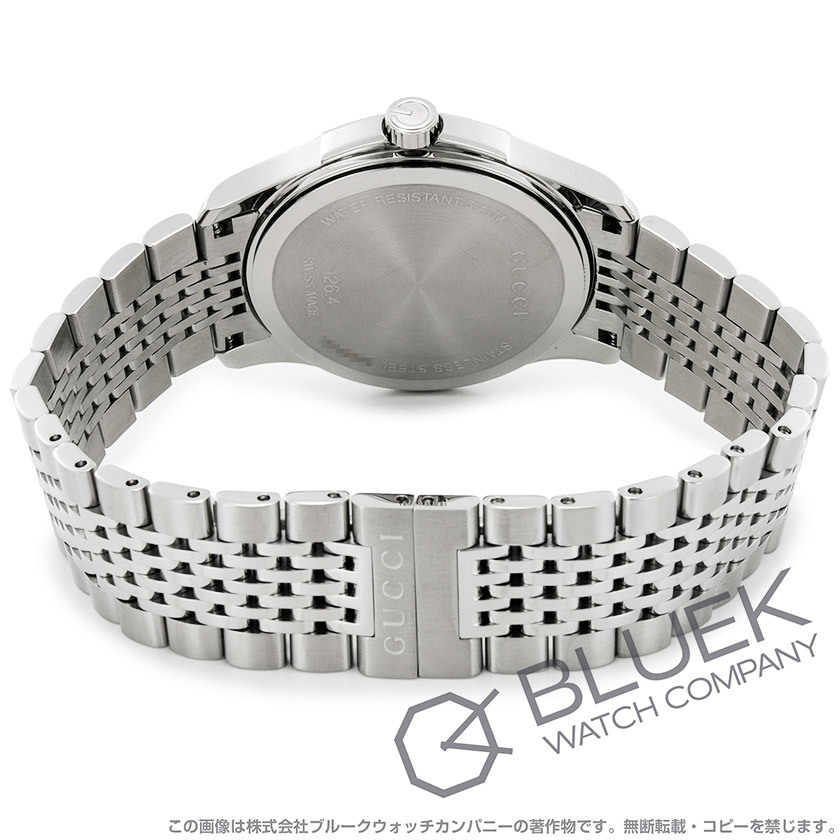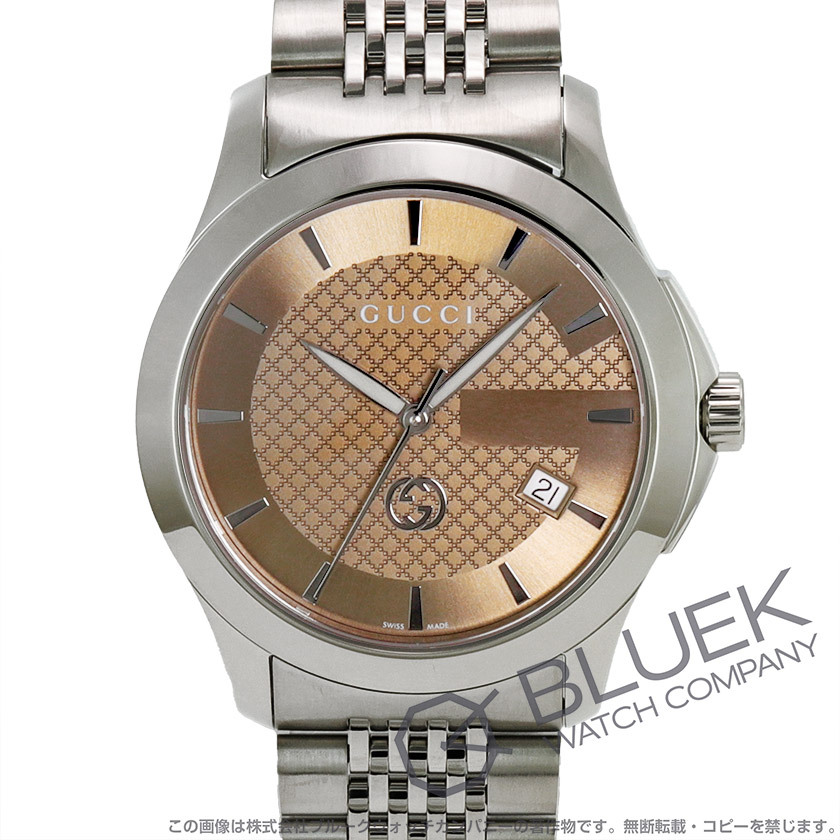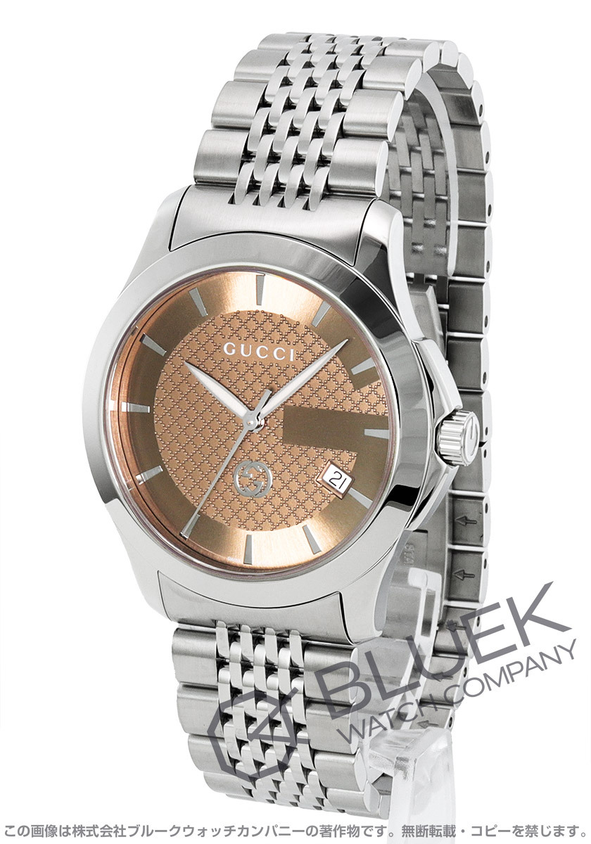 | 光沢シルバー艶やかな厚さ8ミリの38ミリケース&着け心地なめらかな9連ブレスにペール(淡い)ブラウンダイヤルを合わせたGタイムレスは、6時にインターロッキングGを備えたダイヤルが紳士の手元をエレガントに彩るグッチ人気のクオーツモデル。菱形ギョーシェ&外周Gマークにバーインデックス浮かぶダイヤル4時の窓に日付を表示し、指針には蛍光塗料が塗布されて暗所でも視認性を発揮します。中でも薄型ながらリューズガードを備えて誤作動を防ぐこのモデルは、両開きバックル付き9連ブレスも魅力。グッチの洗練を手元で香らせてオンオフ活躍します。 |