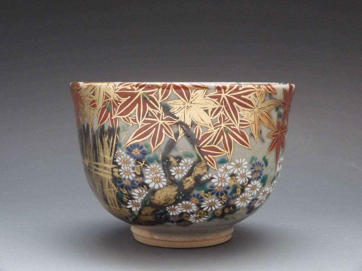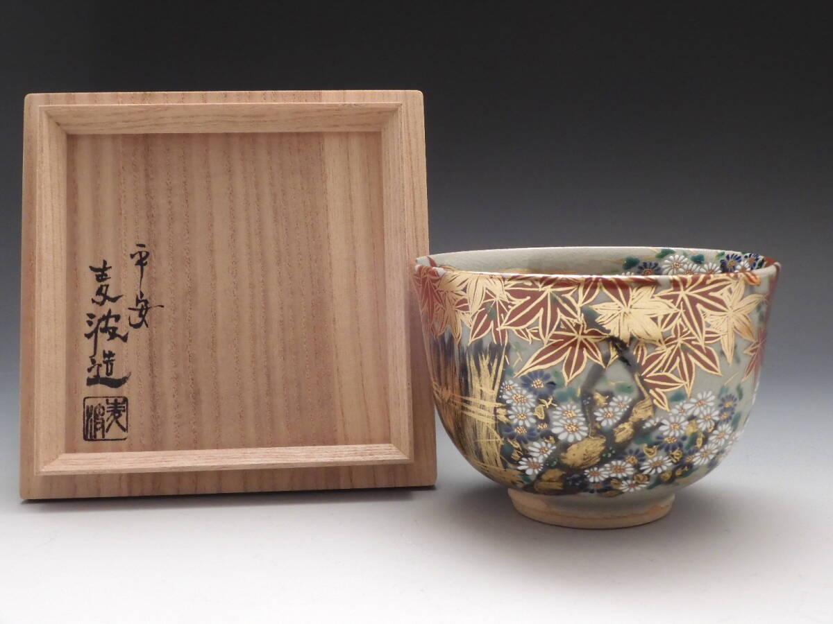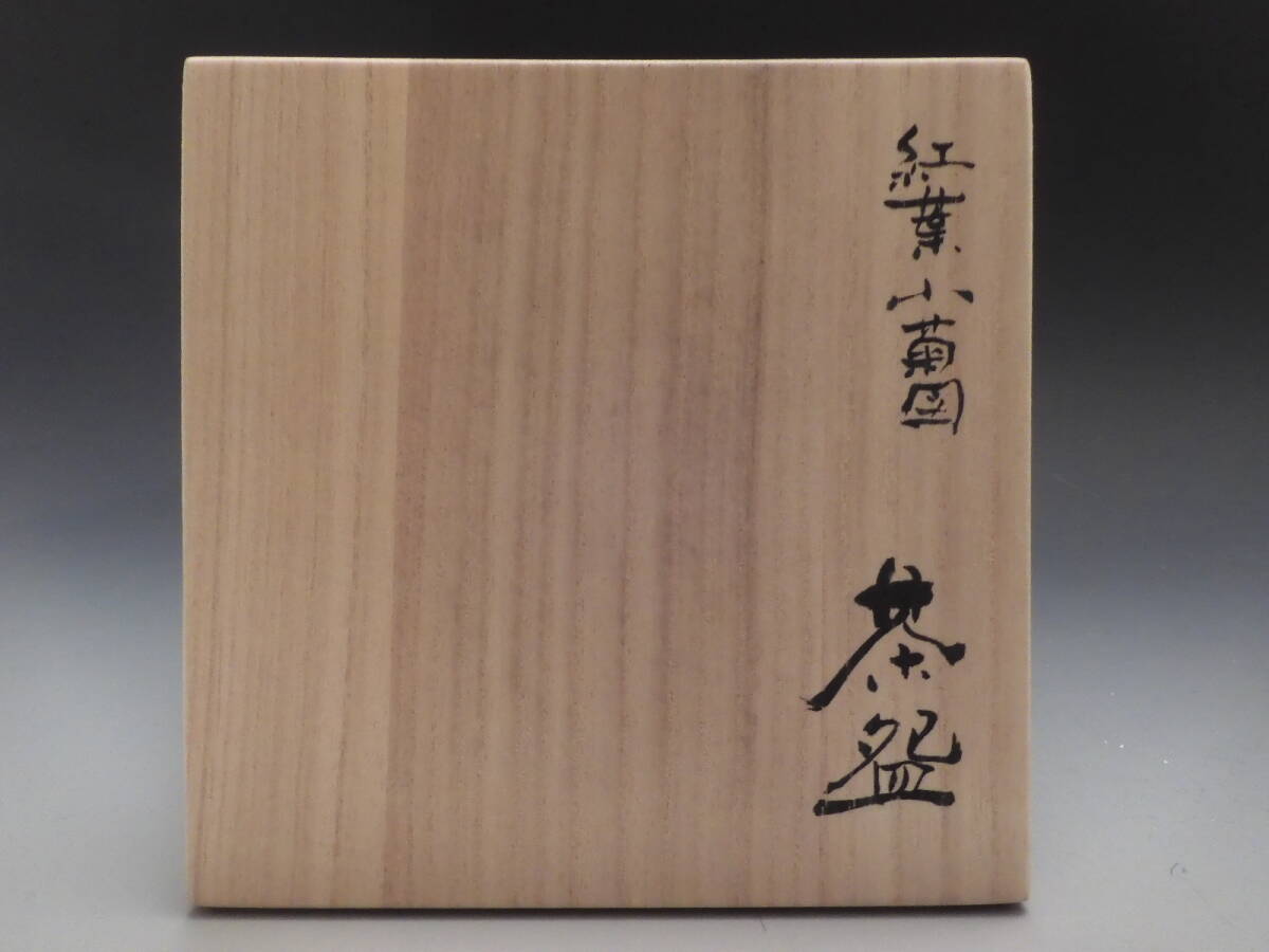 | ○梗○山本 雄次 麦波 造 金彩色絵 紅葉小菊図 茶碗 茶道具 共布 共箱 無傷 未使用 E61◇ |