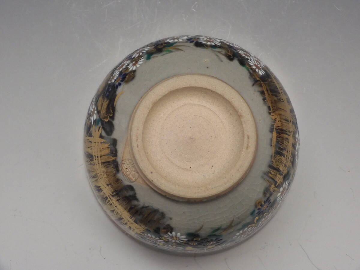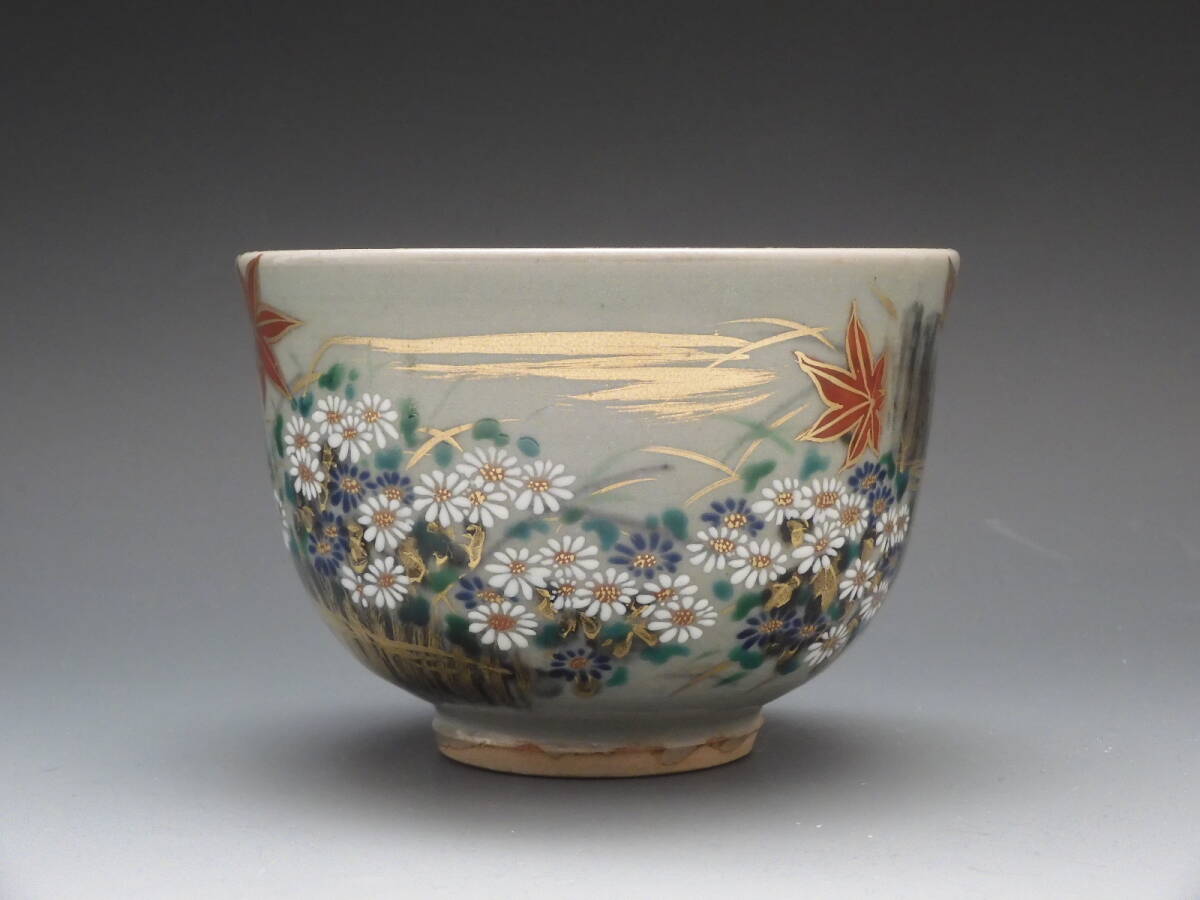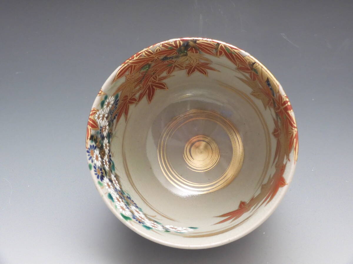 | ○梗○山本 雄次 麦波 造 金彩色絵 紅葉小菊図 茶碗 茶道具 共布 共箱 無傷 未使用 E61◇ |