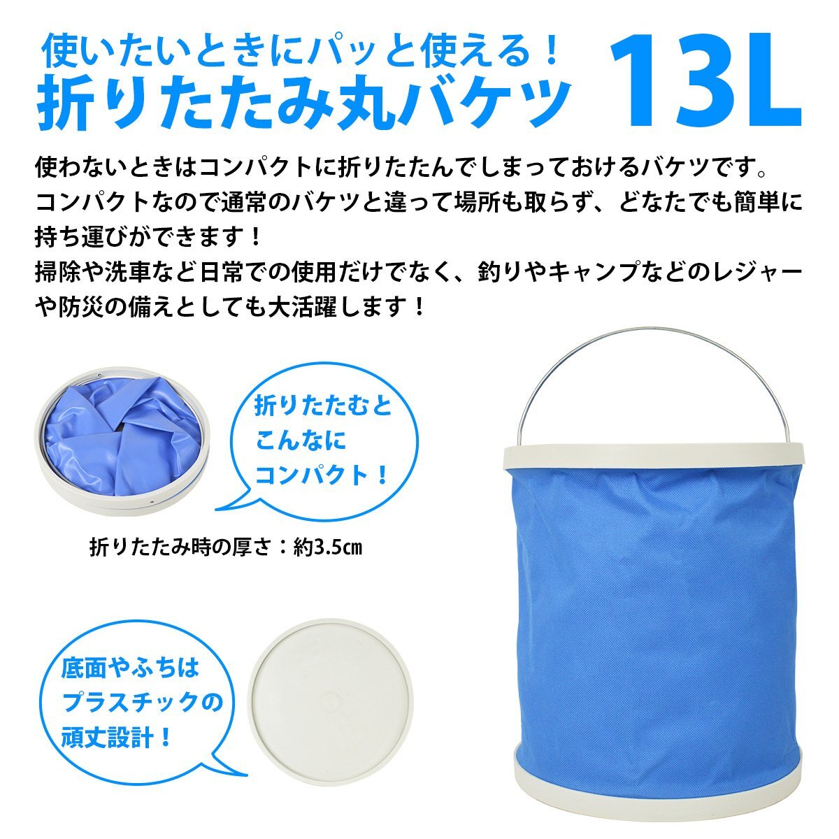 汎用 折りたたみ丸バケツ13L 釣り レジャー 洗車 防災等 ブルー クーラーボックス 生け簀 アウトドア キャンプ バケツ 折り畳み ドラム型