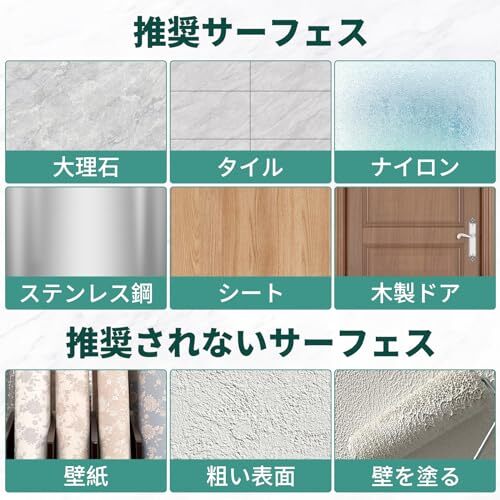 キッチンや風呂場など、様々な場所で使える便利さと、目立たないマット素材のデザイン。 丈夫で耐久性があり、繰り返しの貼り付けや張り直しも可能。しっかりとした粘着力で剥がれる心配なし。
