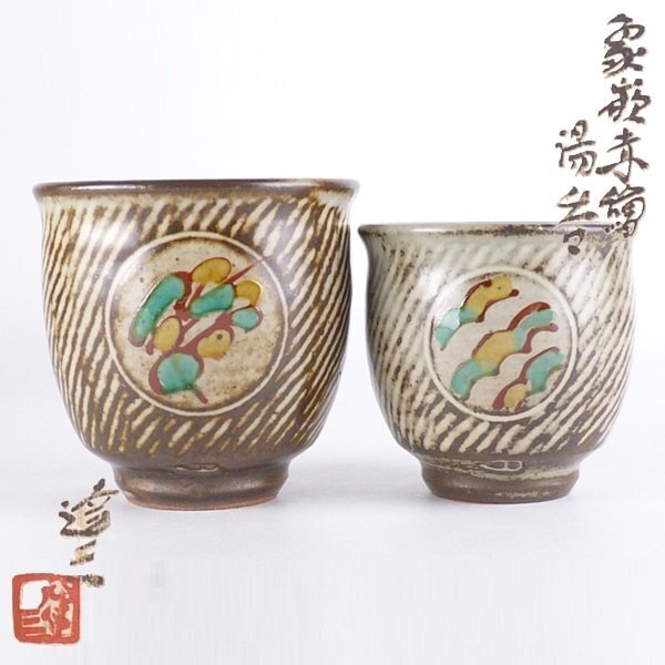 【扇屋】人間国宝 島岡達三「象嵌赤絵 湯呑」共箱 益子焼 2点セット L-2