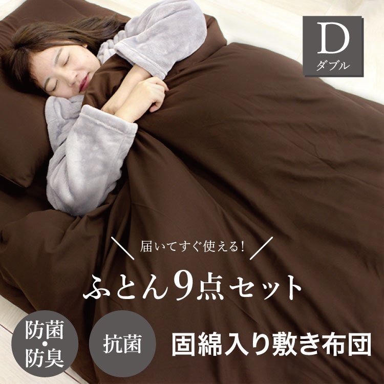届いてすぐ使える寝具8点+収納ケースの9点セットです。 中綿には抗菌・防臭効果のある衛生的な中空ポリエステル綿を使用! 耐摩擦・耐久性に優れ、ホコリが出にくく睡眠の妨げとなるムズムズ感を軽減します。 アレルギーのある方や敏感肌の方におすすめです♪ 底付き感を感じないボリュームで、快適な寝心地とふんわり優しく包みこまれる気持ちよさを実現! また、抗菌防臭加工が施されており、いつでも清潔に使えます。 \すぐ使えるから、こんな方におススメ♪/ ・一人暮らしや新生活を始める方 ・新生活を始める方 ・来客者用の布団一式を考える方 ・布団、寝具の買い替えを考える方 ・社員寮など業務用として考える方 【商品内容】 掛け布団、敷き布団、まくら、掛け布団カバー、敷き布団カバー、まくらカバー、収納ケース 【商品詳細】 カラー:ブラウン サイズ:ダブル(詳細画像参照) 素材:ポリエステル (寝具セット ふとんセット カバーセット ふとんカバー 布団 おしゃれ 人気 おすすめ WEIMALL) |