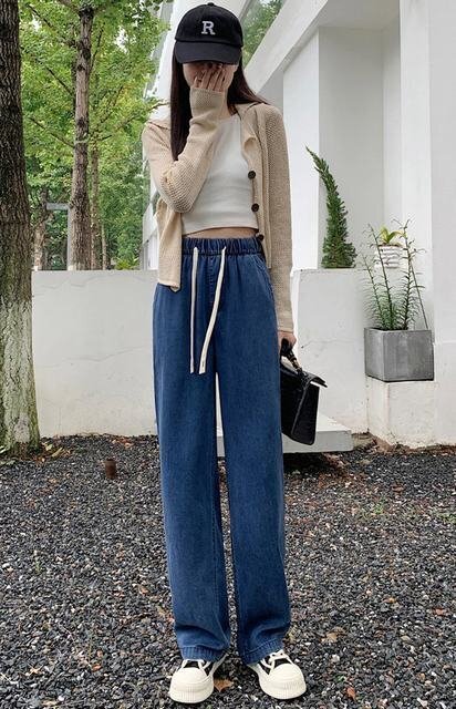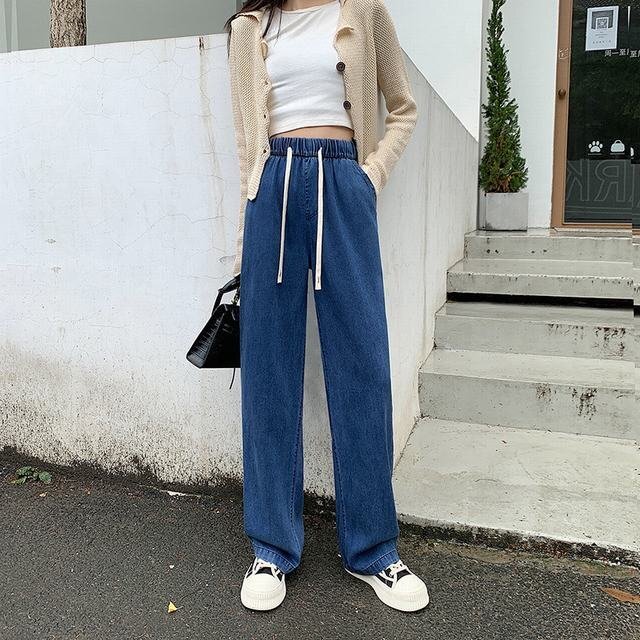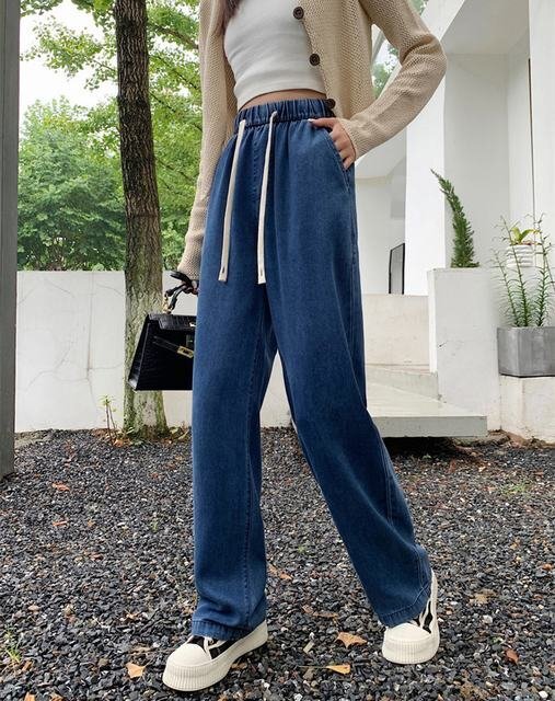 レディース ストレート ワイド 涼感 デニム ひんやり ゆるい ウェストゴム きれいめ 黒 ブルー ジーンズ ロング丈 ブルー L