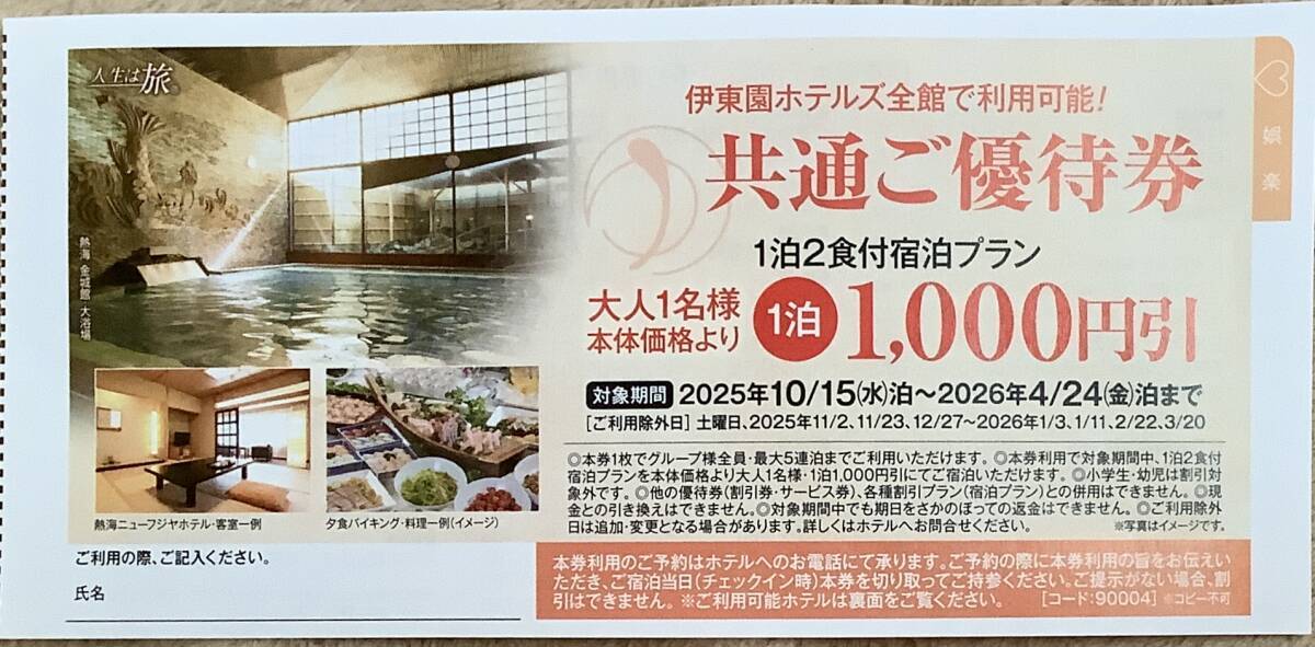 伊東園ホテルズ 共通ご優待券→期限 2026.4.24泊まで/送85〜