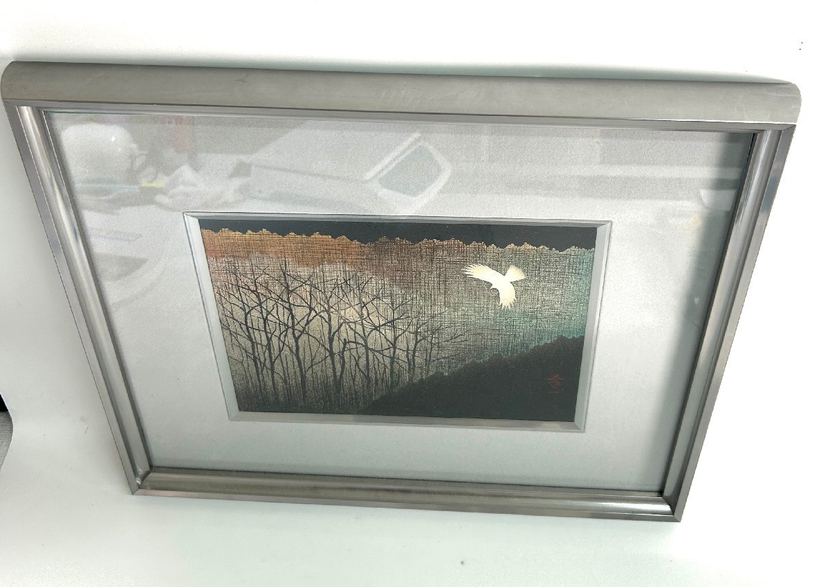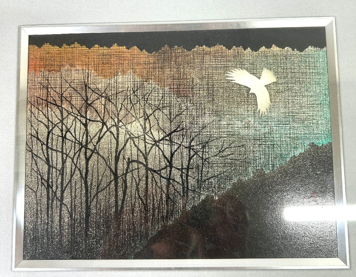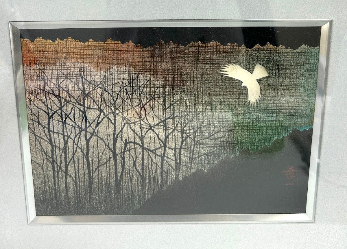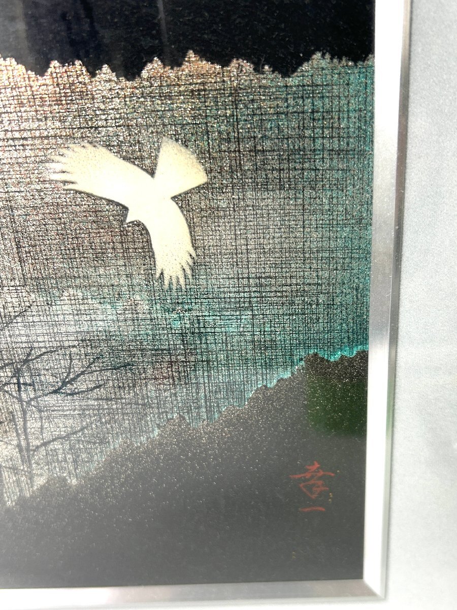 【和の美】 ★1円スタート★ 佐藤幸一 漆額 「 里山 」 共シール 輪島 漆芸 美術品 壁掛 絵画 白い鳥 銘入り 額サイズ35㎝×41㎝