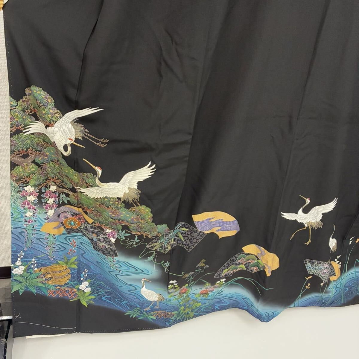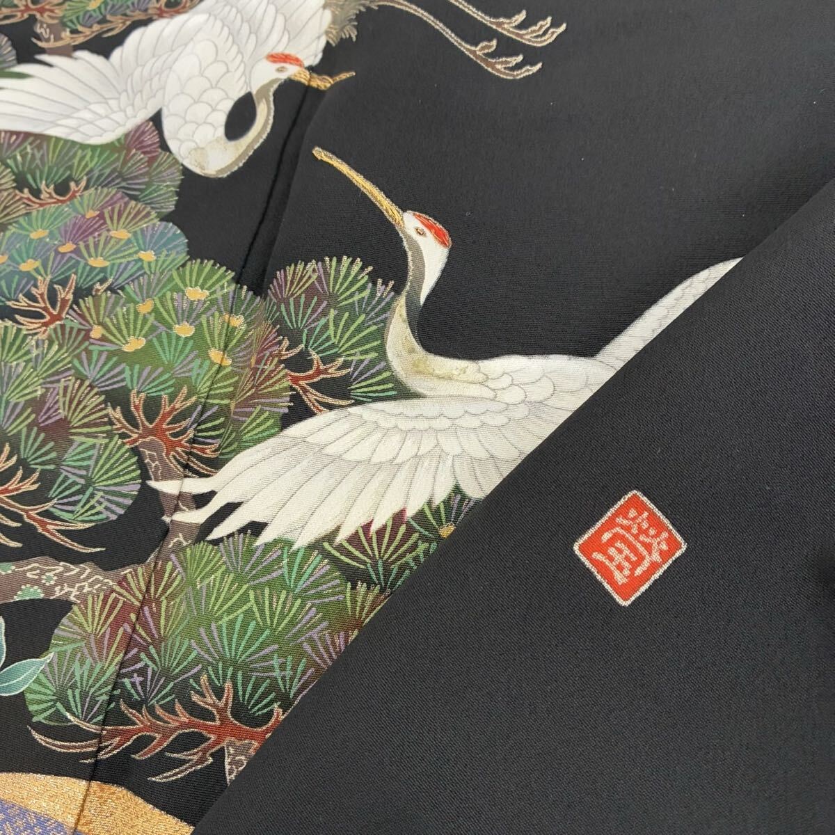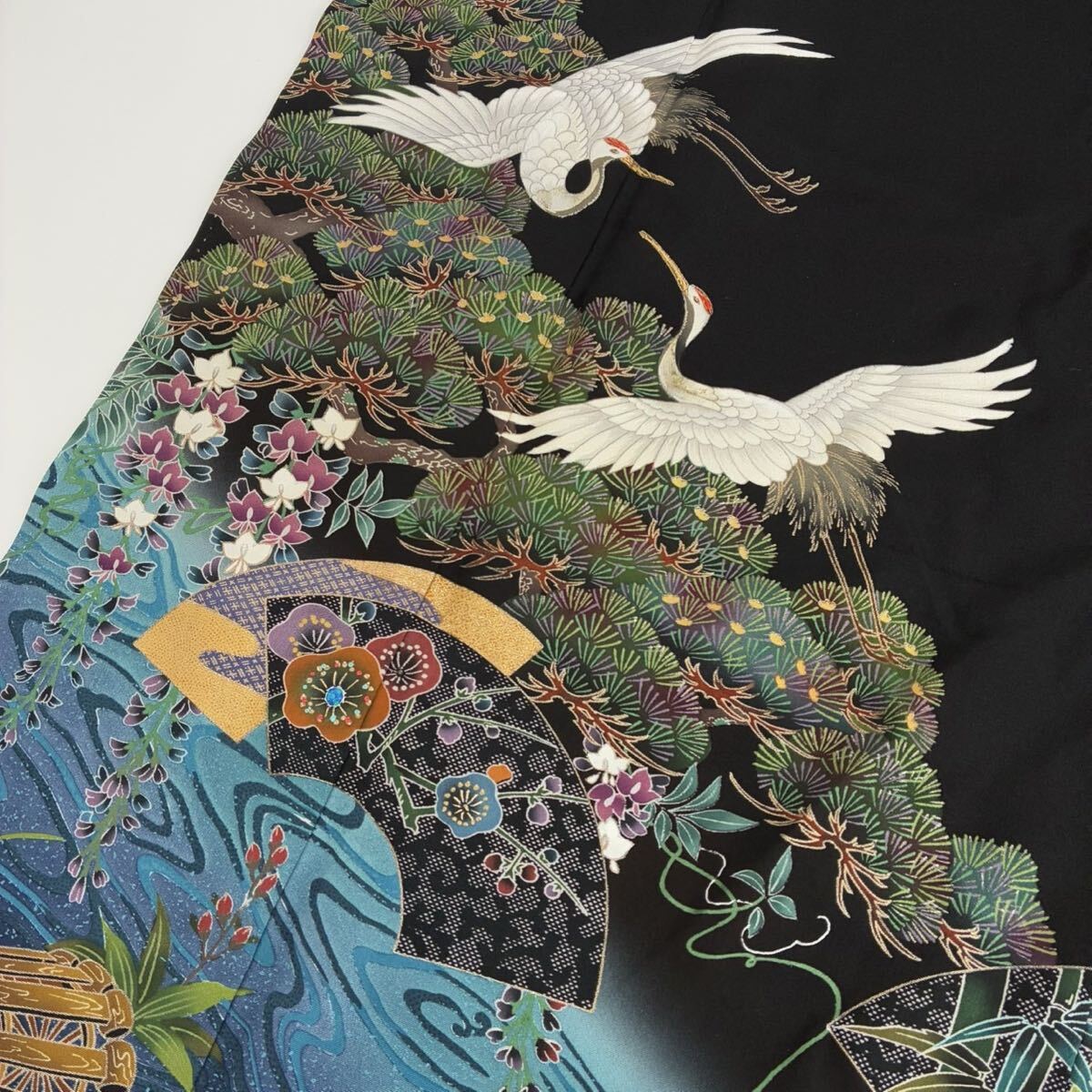 【楓】ビーズの輝き 珍品 黒留袖 正絹 流水 地紙花 鶴 比翼 袷 着物 KK-1090